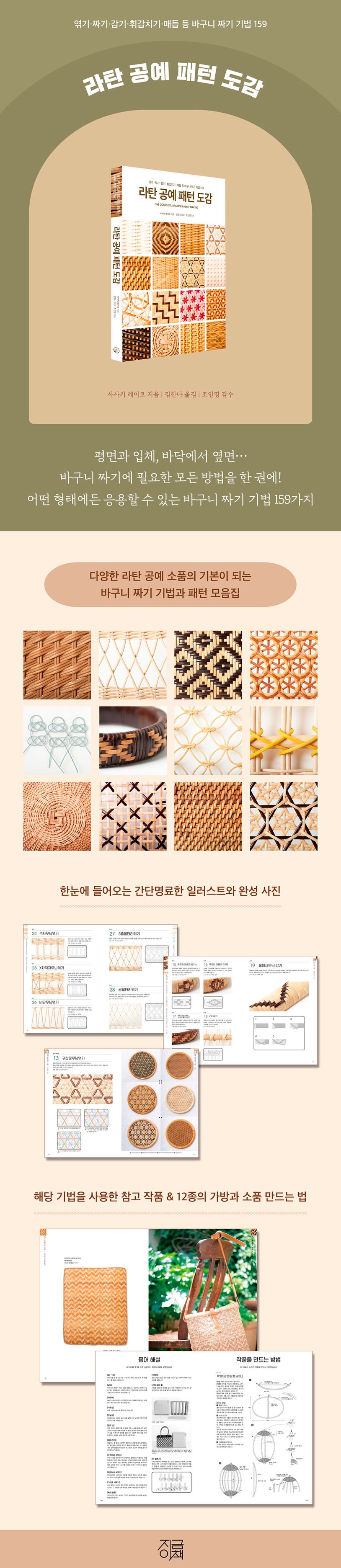 라탄 공예로 만들 수 있는 소품 중 기본이면서 다양하게 변형할 수 있는 바구니. 이 책은 일본 전통 등공예에서 바구니를 만들 때 사용하는 다양한 기법과 완성된 패턴을 한눈에 알아볼 수 있게 소개한다. 면을 채워가는 기본적인 ‘엮기’부터 테두리나 손잡이 등에 사용되는 ‘감기’와 ‘휘갑치기’, 입체적인 장식을 연출할 수 있는 ‘짜기’와 ‘매듭’, 바구니의 용도에 따라 신중하게 선택해야 하는 ‘바닥짜기’까지 기법을 하나하나 익히다 보면 평면이나 입체 어떤 형태든 만들어낼 수 있다. 기법에 대한 사진과 일러스트 외에 명인이 만든 참고 작품이 중간중간 예시로 실려 있으며, 권말에는 채반, 바구니, 연필꽂이, 펜던트, 테이블매트와 6종의 가방까지 총 12가지 소품 만드는 법이 수록되었다.