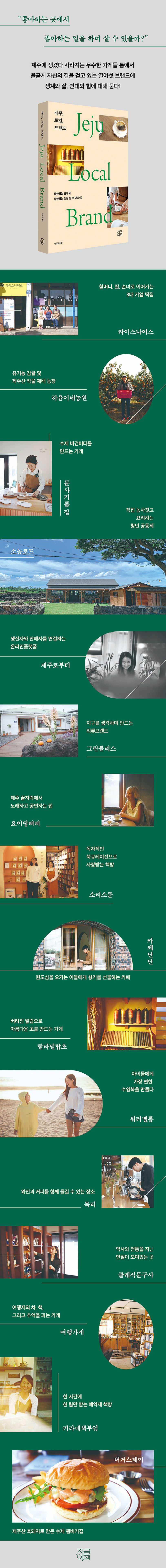 잡지사 기자, 출판사 편집자, 프리랜서 작가를 거쳐 우즈베키스탄에서 국제협력단 활동가로도 살았던 저자는, 다양한 일을 도모했으나 쉽사리 정착하지 못하는 마음의 이유를 찾다가 우연한 기회로 제주에 오게 되고, “어디에서, 어떻게 살 것인가”라는, 오랜 시간 풀지 못했던 저자의 의문은 ‘제주’와 ‘브랜드’를 통해 조금씩 해답을 찾게 되었다. 소유주가 자신의 가축에 낙인을 찍은 것에서부터 시작된 브랜드는, 시간이 흘러 한 제품의 속성, 이름, 포장, 가격, 역사를 뜻하는 의미로 발전되었고, 지금은 ‘자기다움’과 ‘정체성’을 상징하는 단어가 되었다. 저자는 ‘브랜드’라는 단어를 가지고 본인과 같이 제주에 정착한 사람들을 찾기 시작했다. 제주 로컬매거진 〈sarm〉을 창간해 자신만의 브랜드를 만들어가는 사람들을 인터뷰했고, 2018년부터 2023년까지 5년간 쌓은 인터뷰 중 열여섯 개의 브랜드를 뽑아 재정리해 출간한 책이 바로 〈제주, 로컬, 브랜드〉이다. 3대 가업 떡집, 비건버터 공방, 판매자와 구매자를 잇는 온라인 유통업체, 예약제 책방, 공연하는 펍, 아이들을 위한 맞춤 수영복 제작소 등 다채로운 로컬브랜드로부터 설립과정 및 가치관, 앞으로의 방향성까지 한꺼번에 읽을 수 있는 인터뷰집이다.
