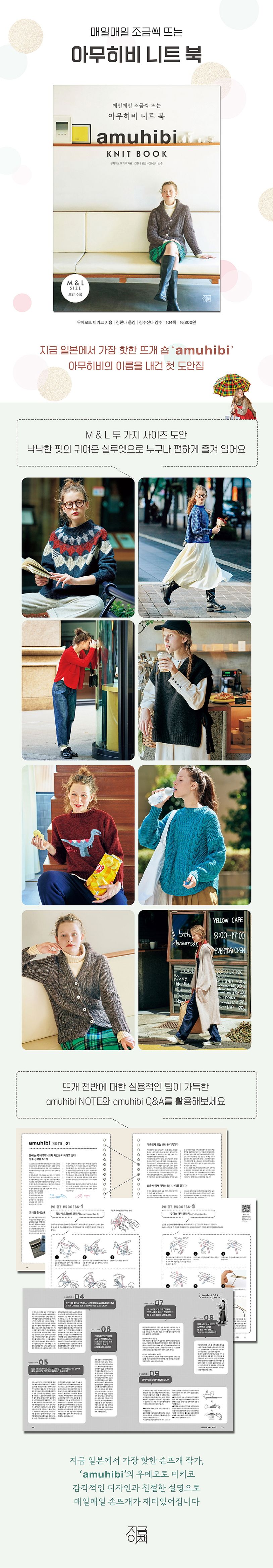 일본 후쿠오카를 여행하는 니터들에게 이미 명소로 알려진 뜨개 숍 ‘아무히비amuhibi’. 이곳을 운영하며 손뜨개 작가이자 강사로 활동하는 우메모토 미키코가 첫 도안집을 선보인다. 이 책 《매일매일 조금씩 뜨는 아무히비 니트 북》에는 그래픽 디자이너로서 다양한 소품과 액세서리도 디자인하고 있는 우메모토 미키코의 개성과 감각을 담은 니트웨어 12종과 소품 5종이 수록되었다. 일본 현지에서 출간 직후 화제에 오르며 “모든 작품을 다 뜨고 싶다”는 독자들의 호평이 쏟아진 이유를 직접 확인해보자.