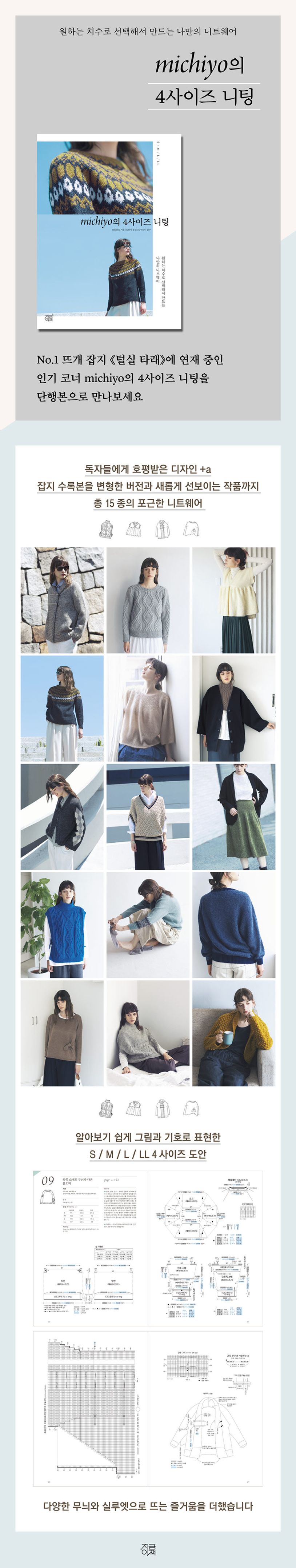 전 세계에서 사랑받으며 국내에도 번역 소개되고 있는 일본의 뜨개 & 핸드메이드 잡지 《털실타래》. 2018년부터 연재해온 코너 ‘michiyo의 4사이즈 니팅’은 일본식 차트형 기호 도안에서는 이례적으로 사이즈 선택의 폭을 넓힌 실용성과 세련된 디자인으로 독자들에게 꾸준한 인기를 얻고 있다. 이 책에서는 연재에서 호평받았던 작품들과 가을겨울 시즌에 맞춰 변형한 작품, 새로운 작품을 더해 총 15종의 니트웨어 도안을 소개한다. 추운 계절에 어울리는 풀오버와 베스트, 카디건이 주를 이루며 롱스커트와 미니 케이프도 1점씩 수록되었다.