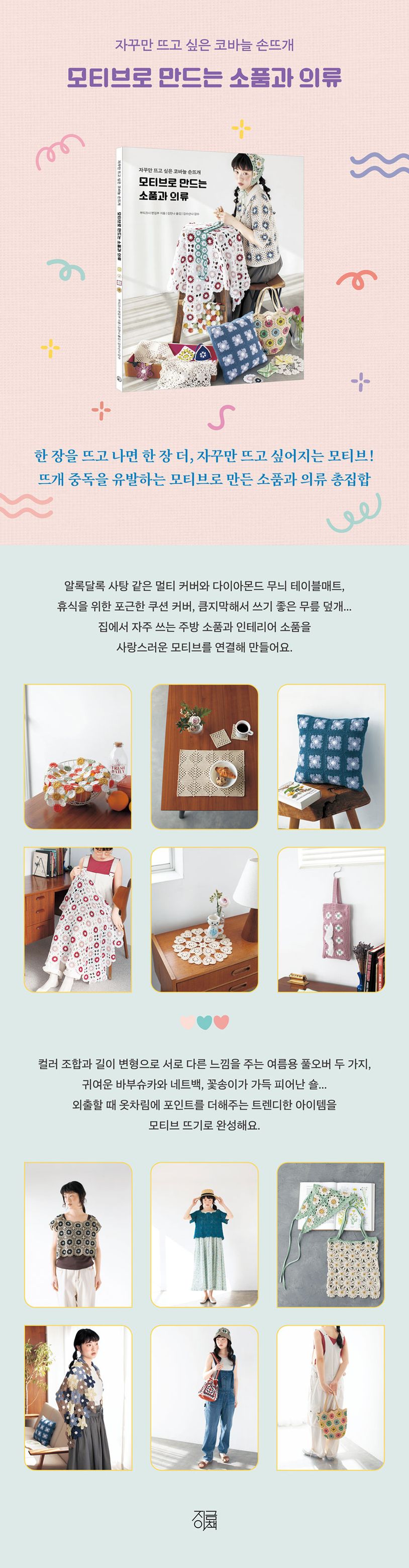 모티브의반복과연결로만드는36가지아이템―봄여름에어울리는가벼운크로셰웨어와집에서늘사용하는일상소품,외출할때자랑하고싶은패션소품손뜨개를시작하면서누구나한번쯤떠보는기본적인모티브.그런데이단순해보이는모티브뜨기만반복해도다양한무늬와형태를만들수있다.여러작가의모티브뜨개작품을엄선해소개하는이도안집에는모티브하면먼저떠오르는코스터와도일리같은클래식한홈데코소품부터간단하게완성하는카드케이스나파우치,테이블매트와쿠션커버같은실용적인일상소품,머리에쓰는삼각숄바부슈카와데이지모양네트백,버킷햇과버킷백,반소매카디건과얇은풀오버및캐미솔등트렌디한패션아이템까지망라되어있다.하마나카사의봄여름용실을사용해뜬이작품들은계절에어울리는산뜻한컬러가돋보이며,의류와모자등은세탁하기쉬운워시코튼이나워셔블리넨실,폭신하고가벼운카폭코튼실을주로사용해실용성을높였다.납작한에코안다리아실로라탄이나메탈릭얀느낌을낸가방,떠서만드는프레임과손잡이등부자재를활용해포인트를만든가방도눈길을끈다.동일한모티브라도색상이나길이변화에따라전혀다른인상을주는가하면,같은형태의모티브라도장수와연결방법을달리하면완전히다른용도의작품으로완성되는것이흥미롭다.자꾸만뜨고싶은코바늘모티브의매력에빠져보자.반복적인손뜨개의리듬을즐기는모티브뜨기컬러변화와크기변경,모티브조합으로무한베리에이션이가능모티브뜨기의장점은동일한패턴을반복하기만하면된다는것.동일한모티브라도여러색상으로알록달록하게만들기도하고,서로다른형태의크고작은모티브를조합하기도하고,디테일에는모티브뜨기외의기법이나바느질이사용되기도하지만,이책의핵심은모티브뜨기다.같은방식으로여러장을뜨다보면패턴이손에익어익숙해지므로일일이도안을보지않고리드미컬하게뜨는재미를느낄수있다.물론나만의감각을더해변화를줄수도있다.우선가장쉬운것은취향대로색상을조합해보는것.또한완성품의치수도모티브를추가하거나생략함으로써손쉽게조정할수있다.모티브한장을더하거나빼는것만으로의류는캡소매와반소매,크롭길이와일반적인길이를오갈수있고,모티브의장수와배치에따라직사각형티슈케이스커버가되거나정사각형쿠션커버가될수도있다.물론이책에소개된여러작품을조합해원하는대로디자인할수도있다.예컨대테이블매트용으로소개된모티브로쿠션커버를만들거나,캐미솔에사용된모티브로가방을뜨는것도가능하다.나만의아이디어를더하면이책을200퍼센트활용할수있을것이다.