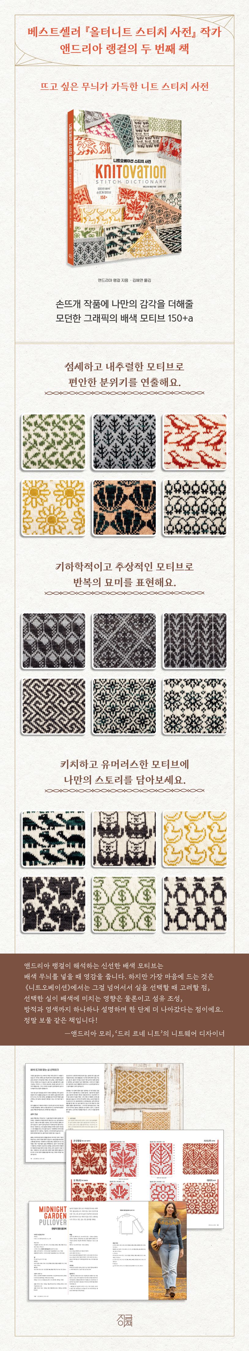 베스트셀러 『올터니트 스티치 사전』 작가 앤드리아 랭걸의 두 번째 책. 그래픽 요소가 강한 독창적인 배색 무늬로 유명한 그는 이번 책에서도 특유의 관찰력과 상상력을 마음껏 발휘했다. 섬세하게 표현된 식물과 귀여운 동물, 요정과 유령 같은 상상 속 존재, 기차와 체스와 티타임 같은 일상적이고 친근한 소재, 영원과 충돌 등 추상적인 키워드로 표현된 기하학적 이미지까지… 무려 150가지가 넘는 모티브의 차트도안과 스와치 샘플이 수록되었다. 그뿐 아니라 배색 뜨기에서 결과물을 좌우하는 실 선택 요령과 뜨개질 팁을 소개하고, 실제로 다양한 모티브를 조합한 비니와 반장갑, 풀오버 뜨는 법을 안내하면서 각각의 모티브를 편물의 형태와 용도에 알맞게 활용해 디자인하는 방법을 설명한다.