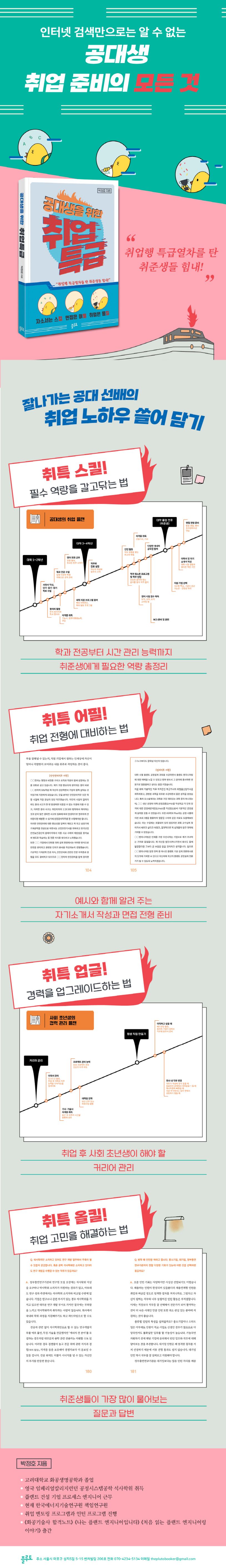 《공대생을 위한 취업특급》은 공대생의 취업 준비에 필요한 모든 것을 한 권에 담았다. 대학에 다닐 때부터 취업 준비 과정에서 해야 할 일을 단계별, 항목별로 차근차근 알려준다. 필수 역량을 쌓는 법, 지원 기업을 선택하는 기준, 업종과 직무별 특징뿐만 아니라 자기소개서 작성과 면접의 경우, 성공 사례를 들어 설명하고 있다.