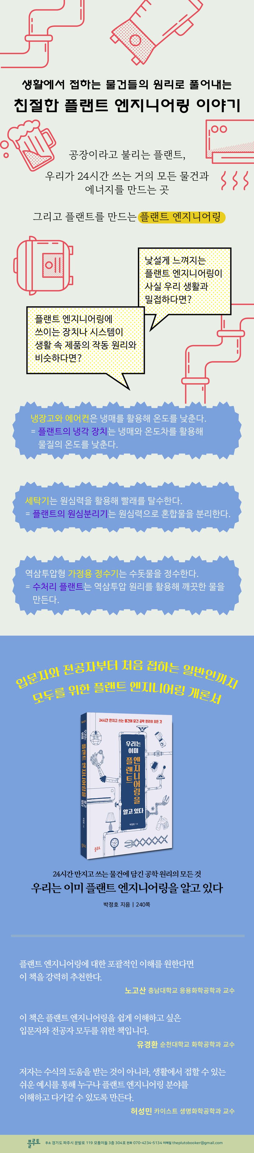 플랜트 엔지니어인 저자는 플랜트 엔지니어링에 쓰이는 장치나 시스템의 공학 원리를 일상에서 쓰는 다양한 제품의 작동 원리로 풀어낸다면 훨씬 이해하기 쉬울 것이라고 생각했다. 에어컨과 냉장고가 냉매를 이용해 온도를 낮추는 원리는 플랜트의 냉각 장치에도 적용되고, 공기청정기의 필터가 먼지를 흡착하는 원리는 플랜트의 흡착탑에 적용된 흡착 원리와 비슷하다.