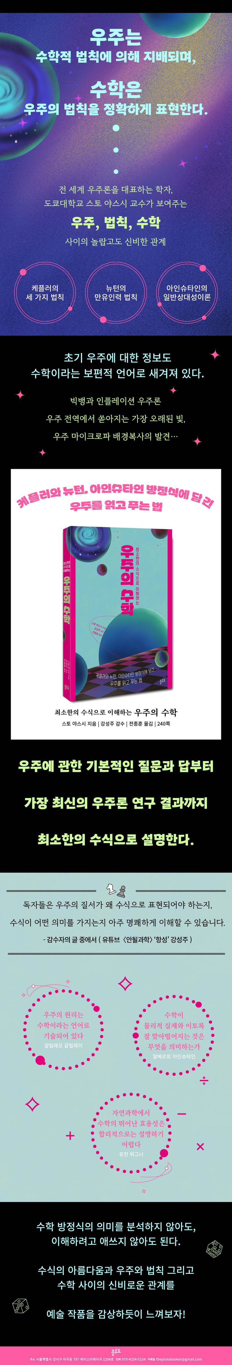 도쿄대학교 스토 야스시 교수는 우주의 구조와 은하의 진화를 연구하는, 전 세계 우주론을 대표하는 학자이다. 저자는 《우주의 수학》에서 우리 우주가 수학적 법칙에 의해 지배된다는 놀라운 사실을 독자에게 보여준다. 우주의 법칙은 수학을 통해 놀라울 정도로 구체적으로 우주를 표현한다. 행성의 운동과 물체의 운동을 정확하게 설명한 케플러 법칙과 뉴턴의 만유인력 법칙은 수학 방정식으로 표현된다. 아인슈타인의 방정식 E=mc2에는, 원자핵 같은 아주 작은 세계부터 드넓은 우주에서 일어나는 폭발에 이르기까지 모든 종류의 에너지 변환에 대한 지식이 들어 있다《우주의 수학》은 우리가 사는 세상을 가장 구체적이고 정확하게 표현하는, 언어로서의 수학을 소개한다. 언제부터 우주의 법칙을 수학으로 표현하게 되었는지, 왜 수학이 우리 우주를 설명하는 가장 좋은 언어인지, 과학자들은 수학을 사용해 우주의 비밀을 어떻게 읽고 쓰는지 설명한다.