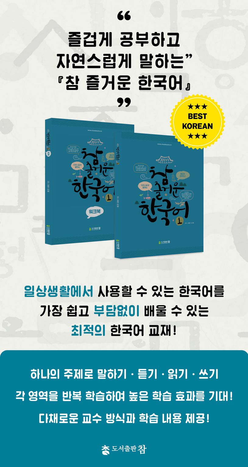 ‘참 즐거운 한국어 1, 2’는 본권과 자습용인 워크북으로 구성되어 있으며 말하기, 듣기, 읽기, 쓰기 등 언어 학습의 기본인 4가지 영역들을 각 단원에서 모두 학습할 수 있어 외국인 학습자를 위한 최적의 한국어 교재다.