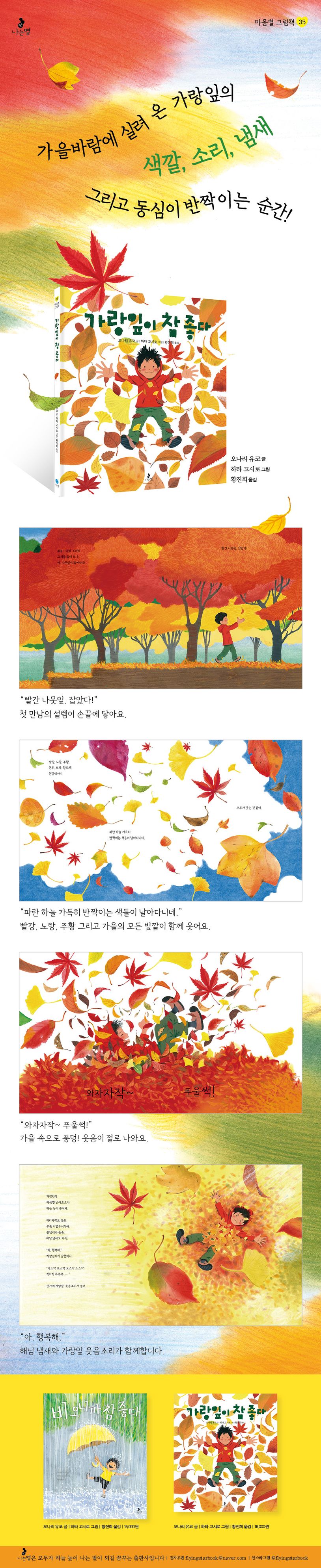 가을 숲의 빛깔과 소리를 한 권에 오롯이 담았습니다. 빨간 가랑잎 하나에서 시작된 아이의 놀이는 하늘만큼 높아진 낙엽 산과 ‘가을의 합창’이 되어 퍼져 갑니다. 작가의 어린 아들이 친구들과 즐기던 놀이에서 영감을 받아 탄생한, 명콤비 오나리 유코와 하타 고시로의 생생한 가을 편! 붉게 물든 단풍 길, 노란 은행잎 카펫, 바람 속에 흩날리는 색색의 가랑잎… 책장을 펼칠 때마다 계절이 건네는 선물이 눈앞에 펼쳐지지요.