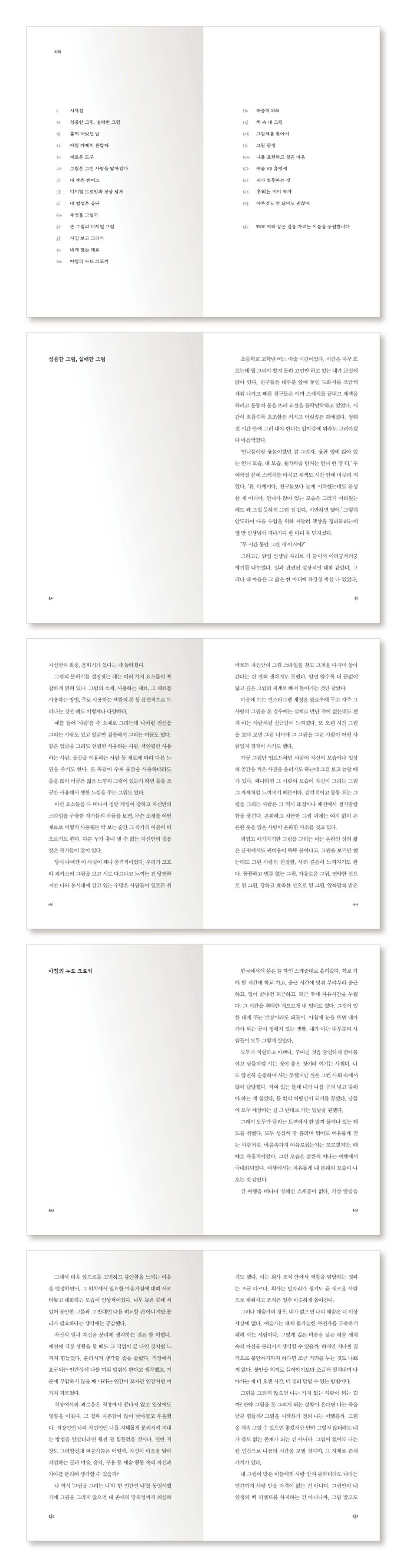 『내가 좋아하는 것들, 드로잉』은 〈성공한 그림, 실패한 그림〉, 〈아침 카페의 관찰자〉, 〈그림은 그린 사람을 닮아있다〉, 〈디지털 드로잉과 상상 날개〉, 〈손 그림과 디지털 그림〉, 〈내게 맞는 재료〉등 주옥같은 작품을 만나볼 수 있는 책이다.