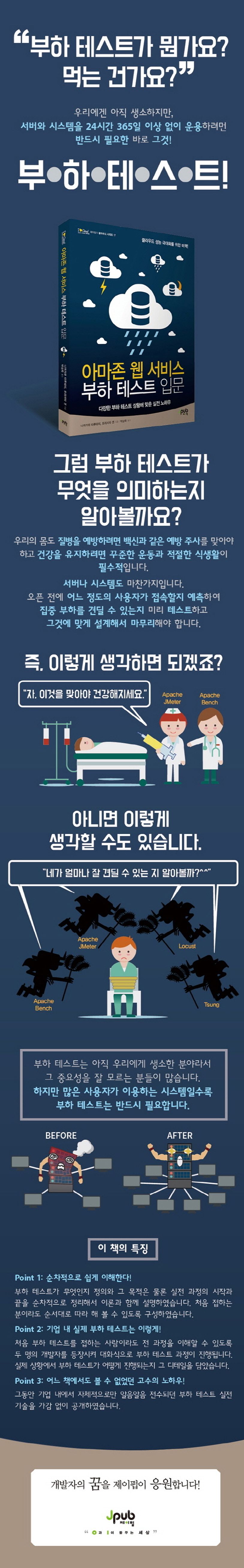 이 책에서는 부하 테스트의 기본적인 정의부터 다양한 부하 테스트 도구를 설명하였습니다. 무엇보다 어렵게 느껴지는 부하 테스트의 진행 과정을 순차적으로 쉽게 설명하였습니다. 단계별로 이론과 실제 발생 상황을 자세히 정리하였고, 선배 개발자와 3년 차 개발자를 등장시켜 기업 내에서의 부하 테스트 업무 처리 과정을 대화식으로 쉽게 풀어내었습니다. 베테랑 개발자인 나카가와 타루하치와 모리시타 켄이 그들 사이에서도 생소했던 고급 노하우를 공개합니다.
