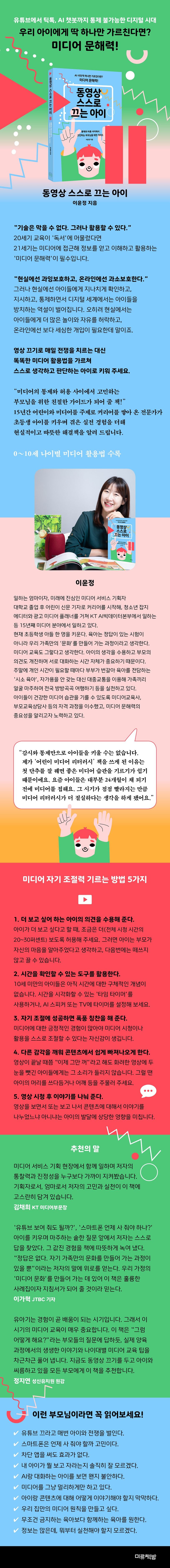 쇼츠와 릴스가 넘쳐나는 시대, 우리나라 만 3~9세 어린이들의 평균 미디어 이용 시간은 하루 3시간을 넘었다. 그야말로 “뇌 썩음”의 시대다. 그렇다고 감시와 통제만으로 아이들을 키울 수는 없다. AI시대를 살아가는 아이들에게 디지털로 정보를 얻는 건 너무도 당연한 일이니까. 디지털 미디어에 끌려다니지 않고 현명하게 사용할 수 있는 ‘미디어 자기 조절력’을 기르려면, 양육자의 엄청난 개입이 필요하다. 15년간 어린이와 미디어를 주제로 커리어를 쌓아온 전문가가 현실적이고 따뜻한 해결책을 제시한다.