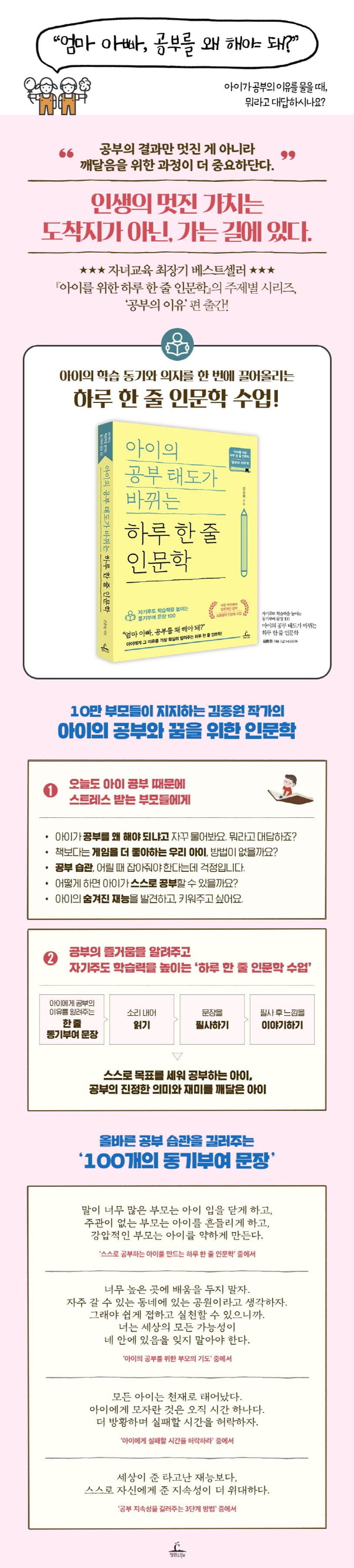 「아이를 위한 하루 한 줄 인문학」의 주제별 시리즈 제1권 공부의 이유 편 『아이의 공부 태도가 바뀌는 하루 한 줄 인문학』. 아이의 학습 동기와 공부 의지를 한 번에 끌어올리는 인문학 자녀교육법을 담은 책이다. 부모와 함께 동기부여 문장들을 읽고 쓰고 느낌을 이야기하며 아이가 왜 자신이 공부를 해야 하는지, 올바른 배움의 자세가 인생에 어떤 도움이 되는지를 깨닫고 스스로 공부하는 법을 터득할 수 있게 도와준다. 또 《하루 한 줄 인문학 공부 노트》를 QR코드로 제공해 아이 스스로 오늘의 공부 목표와 체크 리스트, 실천 후 느낀 점을 자유롭게 적을 수 있도록 했다. 이를 통해 아이의 학습 동기와 의지를 끌어올려주고 결국 배움의 가치와 즐거움을 잘 아는 사람으로 성장하도록 도움을 준다.
