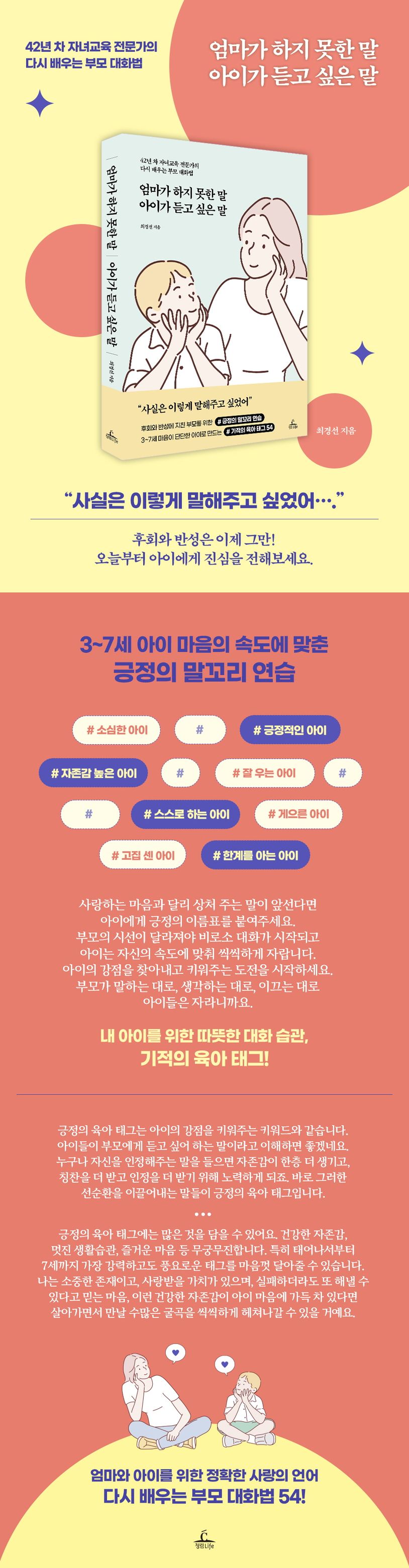 양육자의 한마디 말에 아이 인생이 바뀐다는 사실을 모르는 부모는 없다. 그럼에도 불구하고 자녀교육 전문가를 찾는 부모들의 고민 1순위는 여전히 ‘말’이다. “오늘도 아이에게 짜증을 내고 말았습니다.” “아이를 사랑하는데도 왜 미운 말이 먼저 나올까요?” “도대체 어떻게 말해줘야 할까요?”