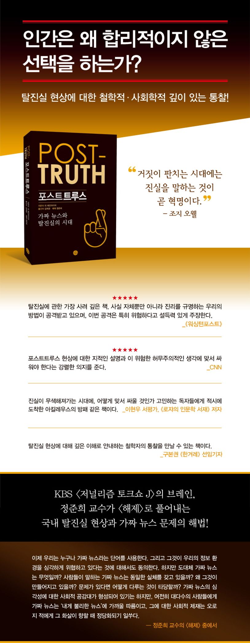 저자는 탈진실 현상에 대해 올바른 인식이 바탕이 될 때 그 문제에 맞서 싸울 수 있다고 이야기하면서 오늘날 우리가 가짜 뉴스와 싸우기 위해서는 단지 거짓을 생성하는 이들만을 탓하고 욕할 게 아니라, 우리가 스스로를 방관하지 않고 우리의 인지 편향을 잘 이해하며 더 나은 뉴스 미디어를 위해 제대로 된 미디어를 지원해야 한다고 강조한다. 이와 더불어 저널리즘 전문가 정준희 교수(중앙대)가 국내 탈진실 문제와 가짜 뉴스 사례에 관해 해제를 담아 내용의 이해를 도왔다.