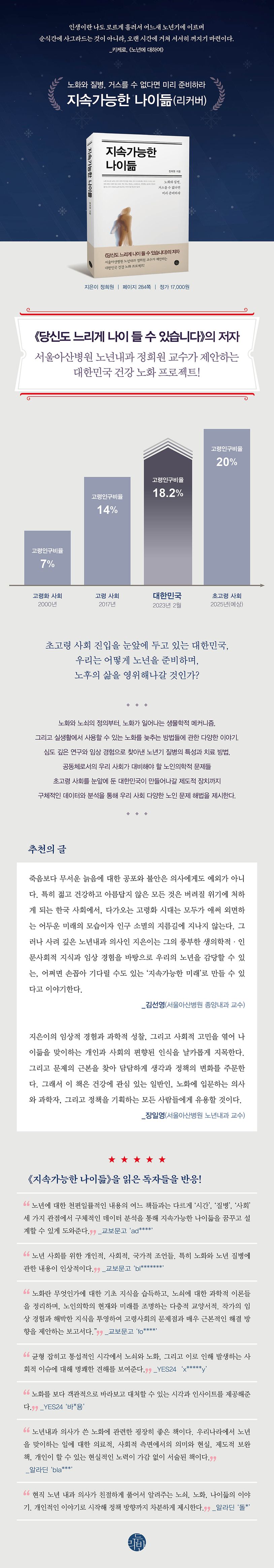 초고령 사회를 눈앞에 두고 있는 우리가 알아야 할 노화와 노쇠, 그리고 나이듦에 대한 이야기다. 노화와 노쇠의 정의부터, 노화가 일어나는 생물학적 메커니즘, 그리고 실생활에서 사용할 수 있는 노화를 늦추는 방법들에 관한 다양한 이야기를 담고 있다. 노년내과 교수이면서 동시에 생물학을 공부한 지은이가 심도 깊은 연구와 임상 경험을 바탕으로 노년기 질병의 특성과 치료 방법, 우리가 생각해보아야 할 노인의학적 문제들, 그리고 공동체로서의 우리 사회가 풀어가야 할 노인 문제들까지 짚어보며, ‘나이듦’이 저주가 아닌 축복이 될 수 있는 다양한 제언들을 살펴본다.