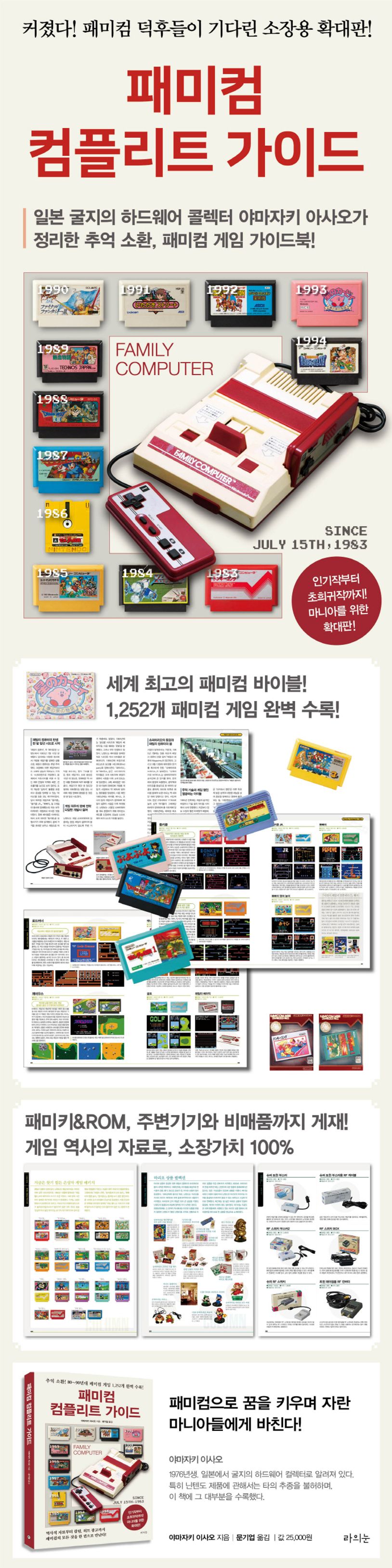 컴플리트 가이드 시리즈의 시작을 알린 패미컴 컴플리트 가이드 확대판이 출간되었다. 그동안 컴플리트 가이드 시리즈를 같은 사이즈, 같은 표지 스타일로 소장하고 싶어 했던 독자들의 기다림이 실현된 것이다. 우선 판형이 확대되어 게임 팩의 모습과 게임 화면을 더 크고 생생하게 볼 수 있으며, 다양한 정보도 쉽게 얻을 수 있게 되었다.