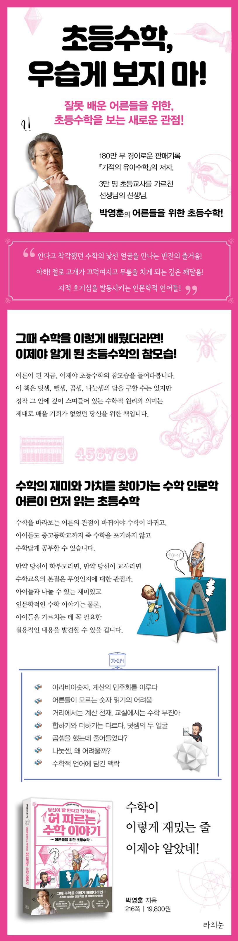 어렵고, 재미 없고, 인생을 살아가는 데 하등 쓸모없는 존재라고 폄훼되어온 수학의 진면목을 발견하게 해주는 책! 이 모든 오해는 수학 자체의 문제가 아니라 수학을 가르치는 방법의 전근대성, 수학을 대하는 태도의 폐쇄성 때문일지도 모른다. 수학에 대한 오해는 오해에서 그치지 않고 대한민국의 수많은 수포자를 양산했고, 그 시작은 초등학교 시절로 거슬러올라간다. 이 책은 사칙연산으로 대변되는 초등수학에 숨겨진 수학의 원리와 의미를 탐색한다. 수학을 좋아하는 사람들이라면 수학의 지평을 넓혀주는 재미있는 인문학 책으로, 초등학교 학부모나 교사라면 아이들을 가르치는 데 꼭 필요한 참고 도서로 활용할 수 있을 것이다.