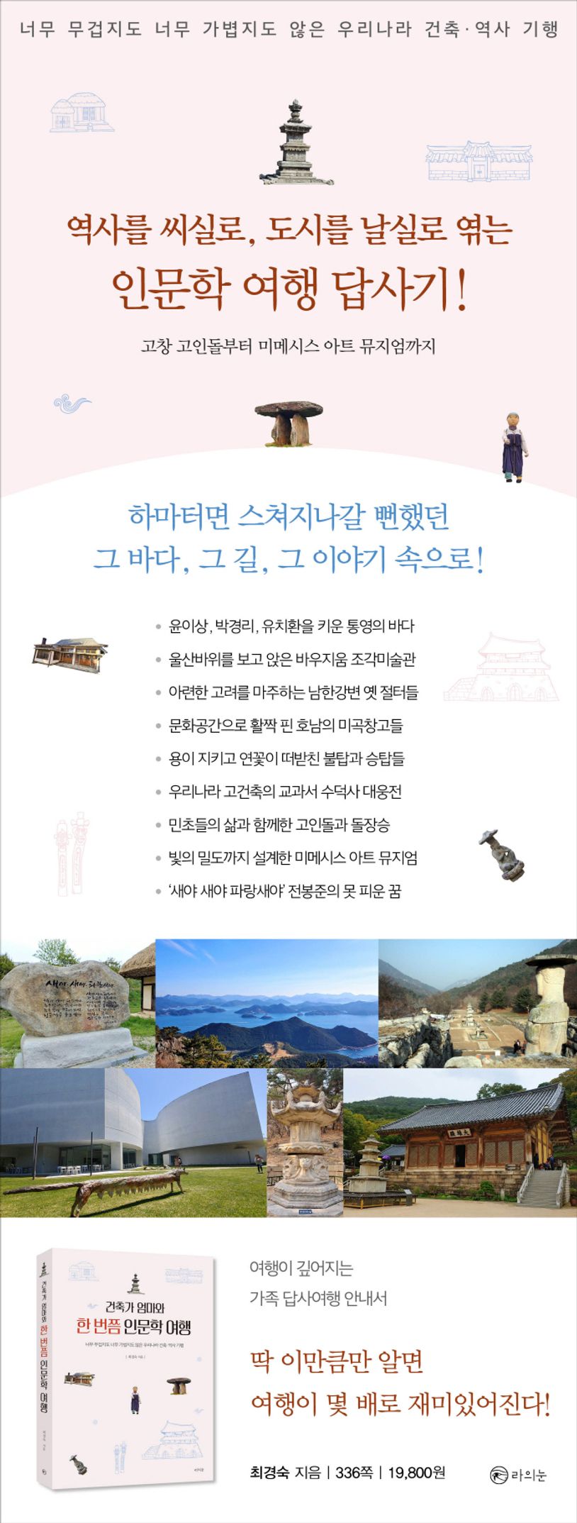 가족 답사여행이란 독보적 분야를 개척한 최경숙 저자가 이번엔 인문학 여행이란 타이틀로 도시, 건축, 역사, 자연을 다면적으로 엮어 풍성한 이야깃거리를 만들어냈다. 인문학의 진정한 효용은 앎이 삶의 관점과 방향을 바꿔줄 때 발휘된다. 그런 측면에서 이 책은 여행지에서의 시공간을 무한히 확장해 보이지 않던 것들이 보이고, 들리지 않던 이야기들이 들리게 해주는 독특한 경험을 제공한다. 알면 보인다는 말은 상투적인 격언이 되었지만, 몰랐더라면 스쳐지나갔을 풍경 속에서 깊은 울림과 성찰을 대면할 수 있다면 더 이상 좋을 수는 없을 것이다.