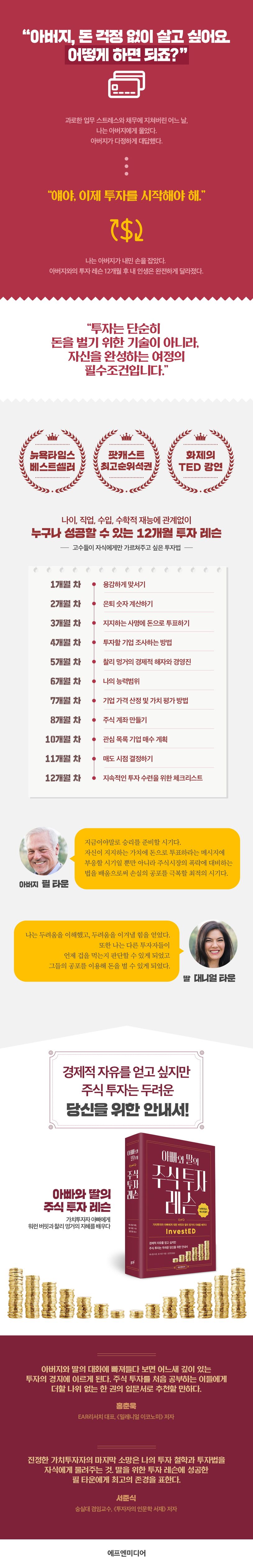 워런 버핏과 찰리 멍거의 투자 철학을 바탕으로 1년 12단계의 커리큘럼으로 구성된 《아빠와 딸의 주식 투자 레슨》은 월별 과제와 목표, 활동 사항 등을 구체적으로 제시하고 친절하게 설명한다. 체크리스트, 핵심 재무지표와 판단 기준, 필요한 데이터를 구할 수 있는 곳까지 알려준다. 단계마다 딸 대니얼 타운과 아버지 필 타운의 진솔한 대화에 빠져들다 보면 어느새 깊이 있는 투자 지혜를 얻게 된다.