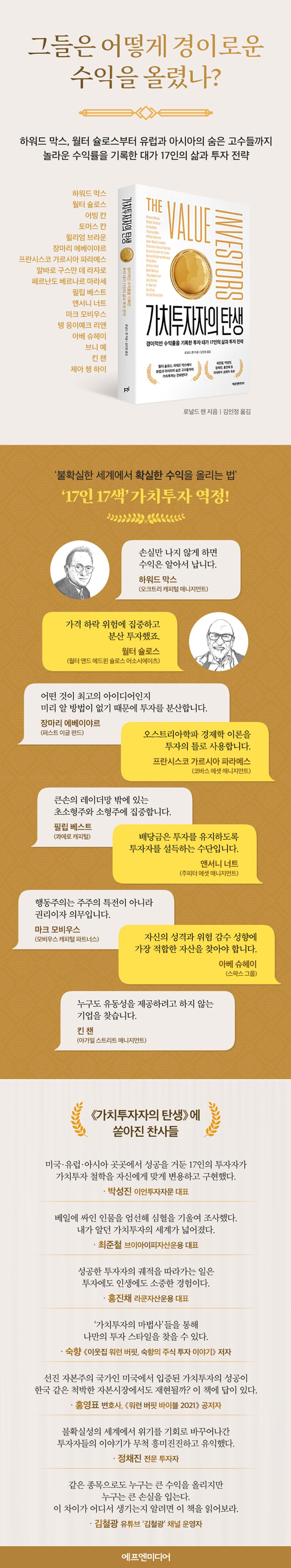 홍콩에서 자산운용사를 운영하는 저자는 현재 가장 주목받는 투자자 하워드 막스부터 벤저민 그레이엄과 동시대를 산 어빙 칸과 월터 슐로스, 워런 버핏의 동료 장마리 에베이야르를 지나 마크 모비우스, 일본의 아베 슈헤이, 홍콩의 체아 쳉 하이 등까지 넓은 세대를 아우른다. 투자 대상과 유형도 채권, 초소형주, 배당주, 특수 상황 기업, 주주 행동주의 등 다양해서 우리가 알던 가치투자의 세계를 넓혀준다.