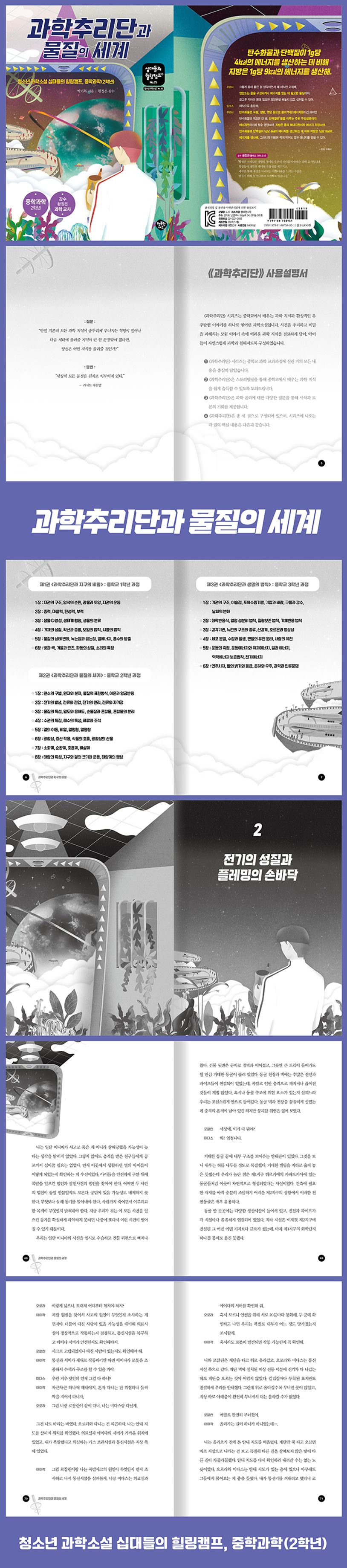 『과학추리단과 물질의 세계』는 중학과학 2학년 전 과정을 흥미진진한 모험과 긴장감 넘치는 과학추리를 통해 지식을 익히도록 돕는다. 또한 ‘인류가 과학기술을 어떻게 사용해야 하는가?’. ‘생명을 어떻게 대할 것인가?’, ‘화석연료를 개발해야 하는가?’, ‘유전자 조작은 어느 수준까지 허락해야 하는가?’, ‘과학이 미래의 희망을 만들려면 어떻게 해야 하는가?’ 등 과학의 발전에 따른 수많은 질문을 하게 만든다.