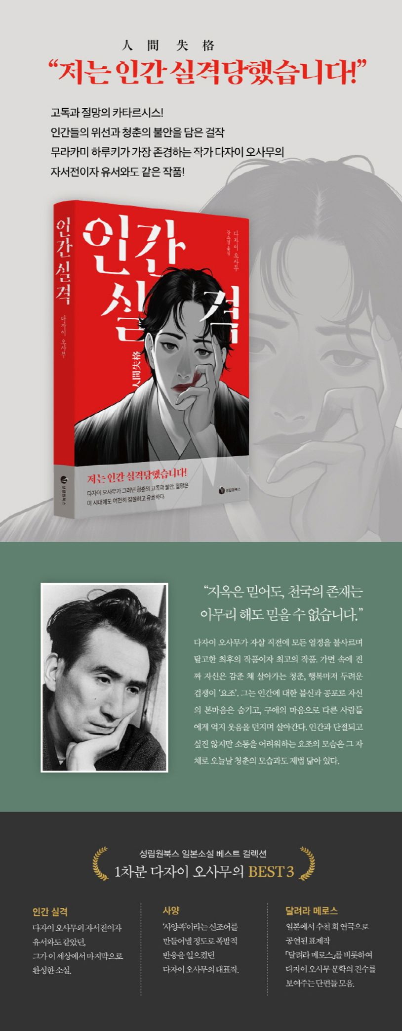 인간, 실격. 강렬한 네 글자의 제목. 다자이 오사무가 자살 직전에 모든 열정을 불사르며 탈고한 최후의 작품이자 최고의 작품 『인간 실격』은 출간된 지 수십 년이 지난 오늘날까지 청춘의 필독서로 불린다.