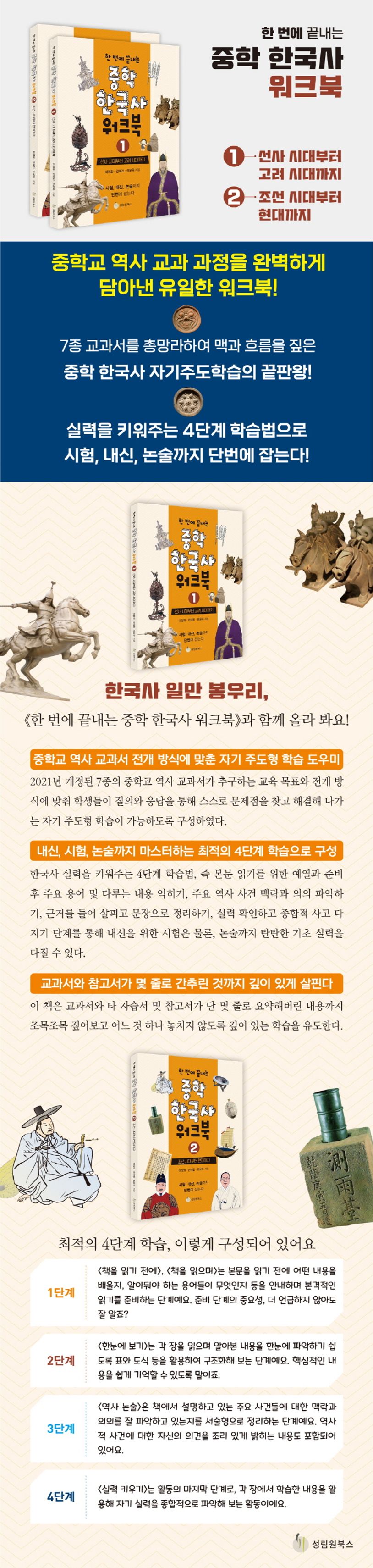 『한 번에 끝내는 중학 한국사』 1, 2권과 짝을 이뤄 한국사 학습에 어려움을 겪는 중학생들에게 효과적인 학습 방법을 제시하는 워크북이다. 2021년 개정된 7종의 중학교 역사 교과서가 추구하는 교육 목표와 전개 방식에 맞춰, 학생들이 질의와 응답을 통해 스스로 문제점을 찾고 해결해 나가는 자기 주도형 학습이 가능하도록 구성하였다. 한국사 실력을 키워주는 4단계 학습법, 즉 1단계, 본문 읽기를 위한 예열과 준비 후 주요 용어 및 내용, 시기별 특징 정리하기, 2단계, 주요 역사 사건 구조화하여 핵심 파악하기. 3단계, 근거를 들어 의견 밝히고 문장으로 정리하기, 마지막 4단계, 학습한 내용 점검하고 종합적인 실력 쌓기를 통해 내신을 위한 시험은 물론, 논술까지 탄탄한 기초 실력을 다질 수 있다. 읽기 전 활동으로 학생들의 흥미를 유발하면서 전체 내용을 그려보게 하며, 읽기 활동을 통해 자신이 학습한 내용을 점검하고 부족한 부분을 정확히 짚어내는 활동이 가장 먼저 배치된다. 나아가 각 장의 주요 어휘들을 중심으로 정보를 도식화하여 관련 내용이 익숙해지도록 돕고, 꼭 알아야 할 내용을 문장으로 정리하며, 마지막으로 실전 문제를 풀어보면서 스스로 자기 실력을 평가하게 한다. 개정된 교과서에서 중요하게 다루는 학습 목표를 충분히 익혀, 학생들이 한국사에 흥미를 느끼고 스스로 학습하게 하는 동기를 부여하며, 자기 주도 학습법까지 습득하게끔 돕는, 역사 학습의 친절한 동반자 역할을 자처하는 책이다.