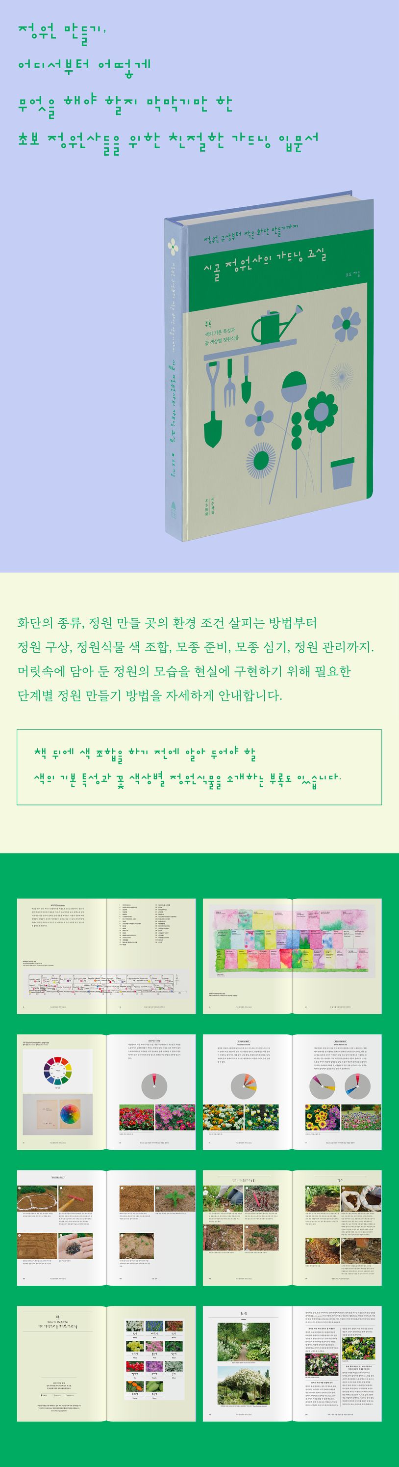 정원 만들기를 처음 시작하는 초보 가드너가 알아 두어야 할 핵심 내용을 단계별로 알려 주는 농사·원예 선생님의 친절한 가드닝 입문서. 정원 만들 곳의 환경 조건 살피는 방법부터 정원 구상, 정원식물 색 조합, 모종 준비, 모종 심기, 정원 관리까지 머릿속에 담아 둔 정원의 모습을 현실에 구현하기 위해 필요한 정원 만들기 방법을 알려 준다.