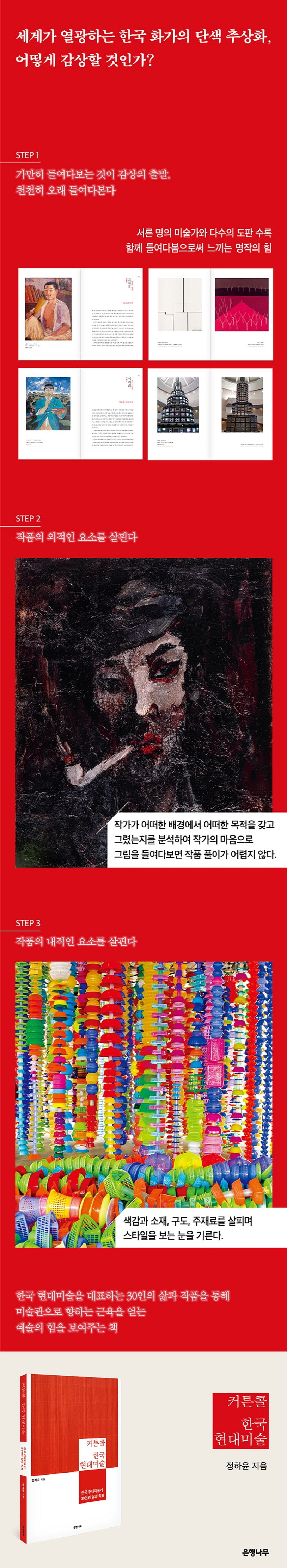 들어가며_친절한입문서가되기를바라며1부20세기초,흔들리는미술고희동|최초의의미김관호|창의적굴절이인성|조선의색나혜석|어떤사명오지호|생명과환희의빛구본웅|모던보이의초상이쾌대|명랑한개척의지2부해방직후,‘한국성’을찾아서박수근|선함과진실함의힘김환기|무엇이되어다시만나랴유영국|현실에발붙인추상이중섭|밝은슬픔장욱진|나는심플하다서세옥|본질에충실한혁신이응노|자유ㆍ평등ㆍ화합의군상천경자|불길을다스리는여행3부1970년대,다양한실험들박서보|살아있는현대미술사정상화|치열한탈속의추상세계김창열|화두를비추는물방울김구림|재미있는것을해내는용기이건용|어디까지가미술인가?이승택|바람을보다백남준|인생을짭짤하고재미있게4부1980년대이후,사회안으로오 윤|민중을대변하는그림신학철|십자로접힌염원윤석남|불쌍한엄마되길거부하다이동기|팝아트라단언하지말라최정화|삶과맞닿은예술서도호|이동하는나의집이 불|당연한것은하나도없다강익중|미술의가능성
