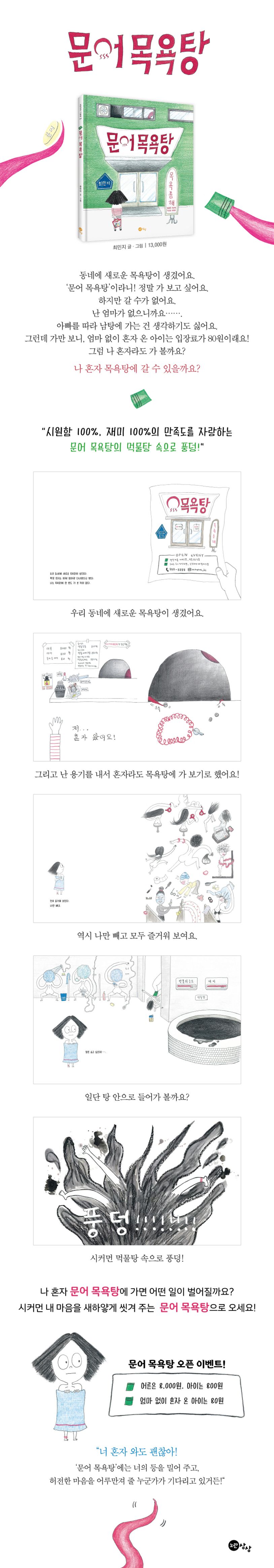 “우리 동네에 새로운 목욕탕이 생겼다. 짝꿍 민지는 어제 엄마랑 다녀왔다고 했다. 나는 목욕탕에 한 번도 가 본 적이 없다. 난 엄마가 없으니까.” 동네에 새로운 목욕탕이 생겨도, 벌써 그곳에 다녀왔다는 친구의 자랑에도 목욕탕에 못 가는 아이가 있어요. 이 여자아이에게는 목욕탕에 함께 가 줄 엄마가 없거든요. 일곱 살이나 먹고 아빠를 따라 남탕에 간다는 건 상상도 하기 싫고요. 그런데 여기에 이런 아이들도 용기 내어 문 두드릴 수 있는 목욕탕이 생겼어요. 바로 노란상상의 그림책 <문어 목욕탕>이지요. 문어 목욕탕은 엄마 없는 아이도, 엄마가 바빠서 함께 못 가는 아이도, 그냥 혼자 목욕탕에 가 보고 싶은 아이도, 누구든 혼자 갈 수 있는 곳이에요. 입장료는 또 얼마나 싼가요? 혼자 온 아이는 단돈 80원에 시원한 목욕을 즐길 수 있어요. 용돈을 조금 더 들고 간다면 몸이 튼튼해지는 먹물 우유도 하나 사 먹을 수 있고요. 시커먼 머리를 더 시커멓게 만들어 줄 먹물 샴푸도 준비되어 있어요. 물론 준비된 것은 이뿐만이 아니에요.