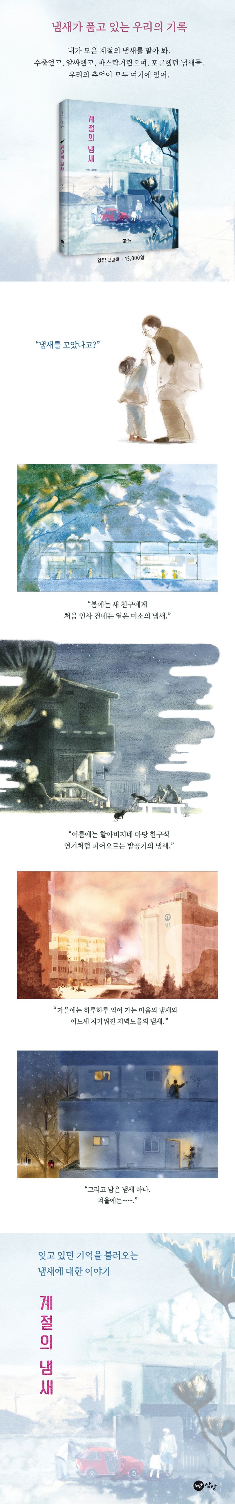 오직 그 순간에만 느낄 수 있는 냄새를 통해 한 아이가 어떤 환경 속에서 어떤 감정을 느끼며 지내왔는지, 또 그 시간 동안 어떻게 성장하였는지를 보여 주는 그림책입니다. 아이가 걸어 온 시간들 속의 냄새를 함께 맡으며 소중한 기억을 다시 한번 펼쳐 보세요.