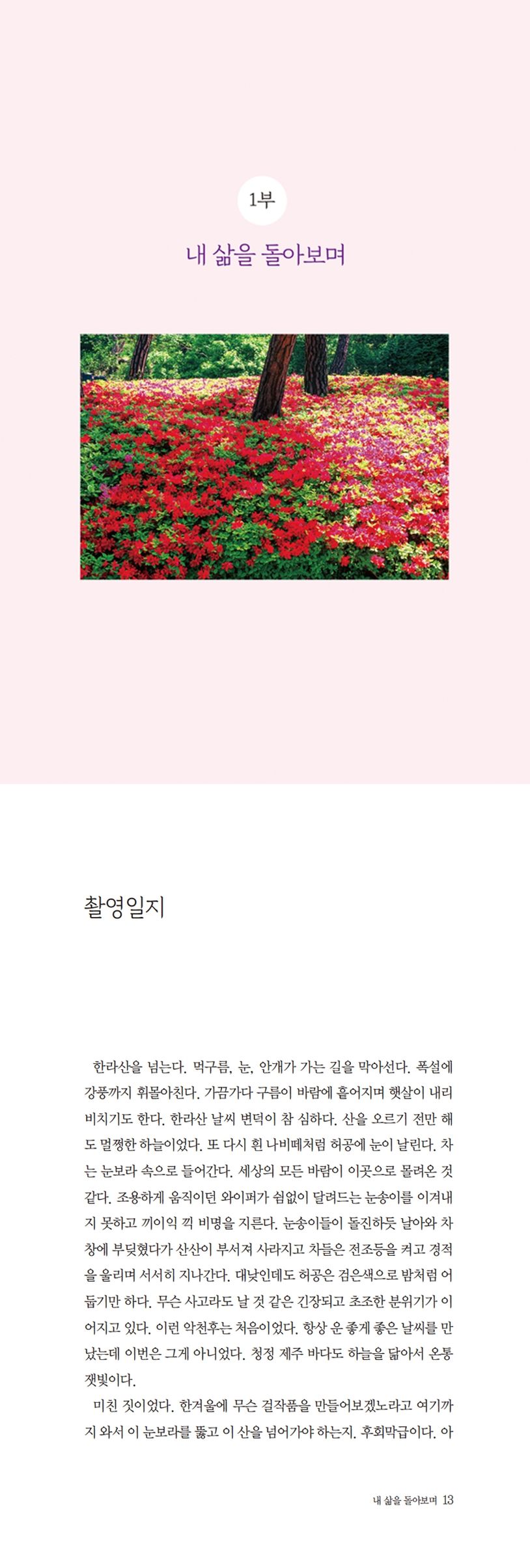 1부_내삶을돌아보며촬영일지길들이기습관의힘내삶을돌아보며그리운친구그친구네집건망증4월엔단오풍정2부_이집트사막투어이상한나라인도힐링여행로까곶을다녀와서소록도연가황금의나라판문점에부는바람백두산을다녀와서정원순례기이집트사막투어3부_집으로가는길기발한자살여행집으로가는길정의의사도는어디에휴거의추억종소리와함께첫사랑유년의뜨락심판여자라는이유로4부_하산길에서억새꽃의계절미장원에서의단상불청객만우절날아침에하산길에서이루어질수없는사랑회오리바람내영혼의스승일상의행복5부_고향별곡그녀의시간옛날이야기들려주는할머니거리의노인백세시대의그늘마지막화장유품을정리하며황토방에서하루고향별곡