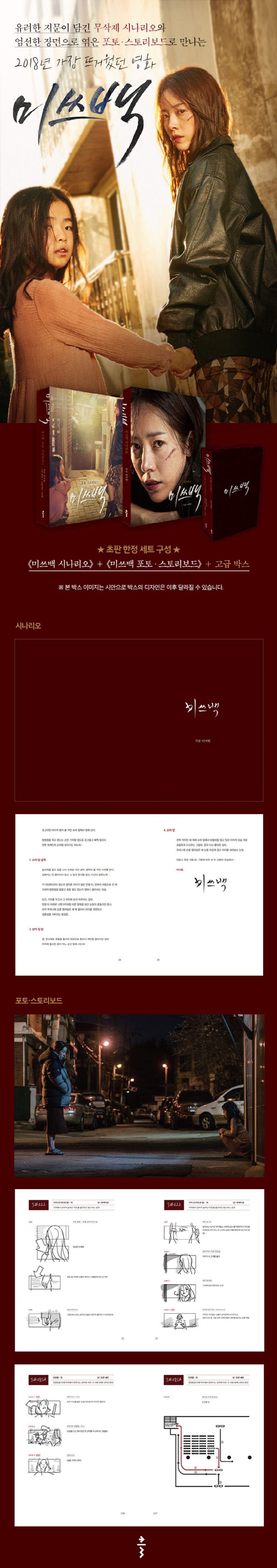 《미쓰백 세트》는 ‘쓰백러’ ‘영혼 관람’이라는 신조어를 만들며 우리나라 영화사에 기록될 만큼 뜨거웠던 영화 〈미쓰백〉의 무삭제 오리지널 시나리오를 옮긴 《미쓰백 시나리오》와 현장에서 쓰인 스토리보드와 생생한 스틸을 엄선하여 엮은 《미쓰백 포토·스토리보드》로 구성되었다. 초판 한정으로 고급스러운 박스에 담아 소장할 수 있도록 했다.