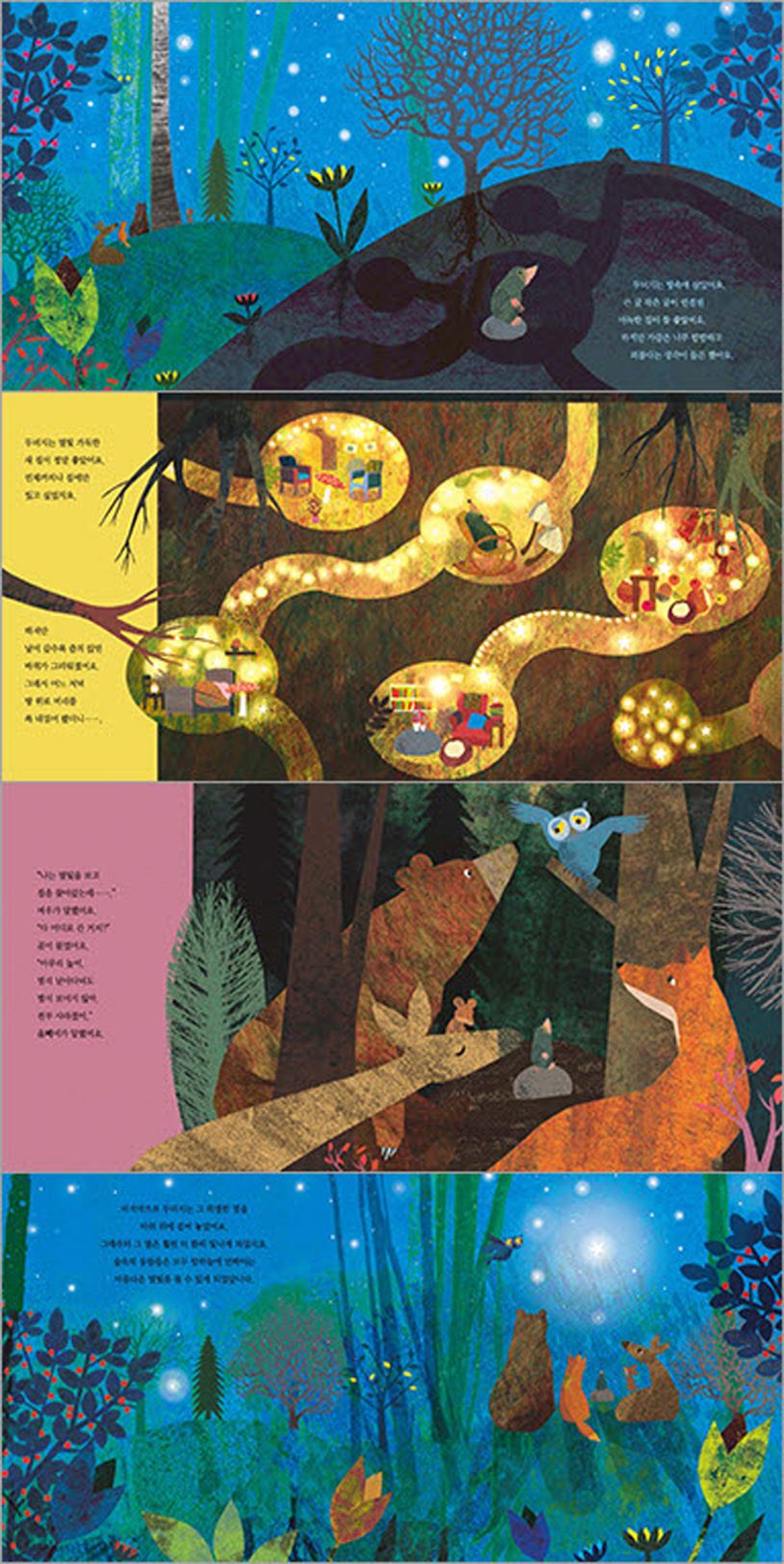 땅속에 사는 두더지는 밤마다 가장 좋아하는 바위에 앉아 하늘을 올려다보며 별빛 보는 것을 좋아했어요. 그날도 바위에 앉아 하늘을 보는데 별똥별 하나가 빛을 뿜어내며 떨어졌어요. 두더지는 얼른 눈을 감고 소원을 빌었지요. “하늘에 있는 별을 모두 갖고 싶어요.” 그러자 하늘까지 닿는 사다리가 생긴 거예요. 두더지는 별을 모두 따서 집으로 가져왔어요. 매일 땅속에서 별빛 가득한 집에 있던 두더지는 문득 바위가 그리워졌어요. 그래서 땅 위로 머리를 쏙 내밀어 봤더니, 아무 것도 없었어요. 하늘은 까맣기만 했어요.