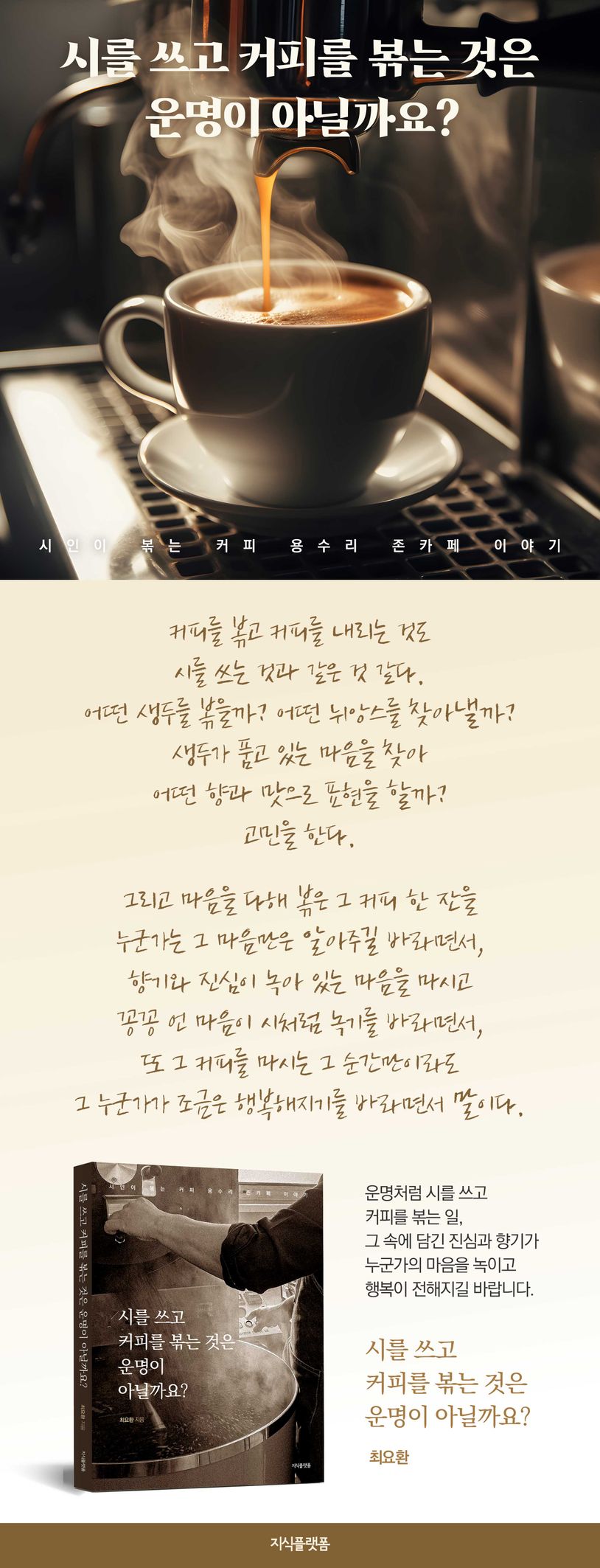최요환 시인의 시와 에세이는 용수리 존카페에서의 일상과 삶의 다양한 순간들을 담고 있다. 그가 진심으로 커피를 볶고 사람을 대하는 마음은 따뜻한 울림을 전해준다. 커피를 사랑하는 사람들뿐만 아니라, 삶의 지혜와 위로를 찾고 싶은 모든 사람들에게 추천하고 싶은 책이다.