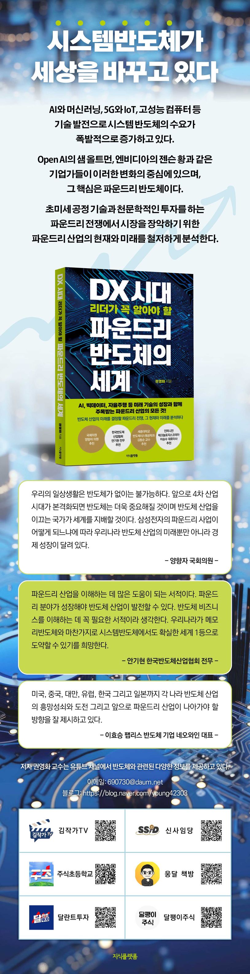 이 책은 파운드리 산업의 생태와 비즈니스 분야에 중점을 두고 있어 경영자와 투자자에게 꼭 필요하다. 국내외 파운드리 산업에 대해 자세히 설명하고 있으며, 반도체 산업의 흥망성쇠와 도전, 그리고 앞으로의 방향을 제시하고 있다.