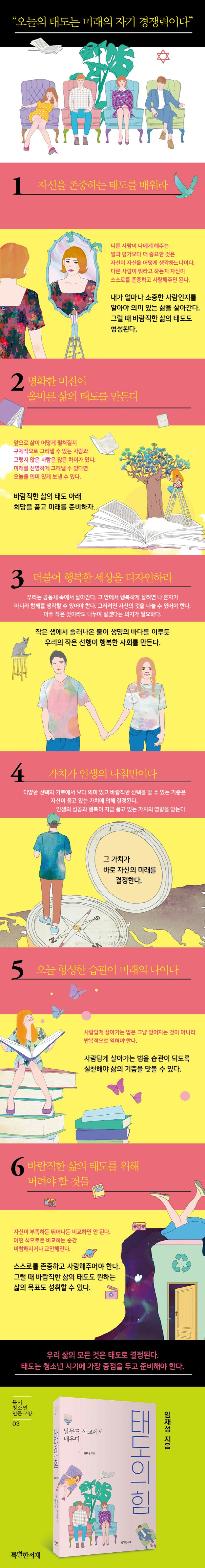 프롤로그?태도가경쟁력이다1장자신을존중하는태도를배워라자신을존중하는사람이돼라자신의일을깊이반성하며살펴라감사가오늘의삶을바꾼다인간의모든일은마음에의해좌우된다2장명확한비전이올바른삶의태도를만든다오늘을의미있게살게하는원동력가장나다운것으로승부하라실패의두려움에맞서는용기를가져라지혜가분별력있는삶을살게한다3장더불어행복한세상을디자인하라억지로라도선행을실천하라사람의마음을얻는진정한힘인공지능시대의필수역량은무엇인가소통이돼야‘더불어’가가능해진다경청이의사소통의시작점이다바람직한시민의식으로무장하라4장가치가인생의나침반이다성공적인삶이무엇인지정의를내려라내가가장중요하게여기는것은무엇인가책임을완수하는능력을키워라정직하면떳떳하고당당하게살수있다5장오늘형성한습관이미래의나다말투가인생을좌우하는방향타이다오늘삶의밀도가내일을바꾼다웃을일이없어도웃어라평소듣는평판이미래의나이다배움은평생이어가는것이다6장바람직한삶의태도를위해버려야할것들삶을무너뜨리는씨앗은심지마라욱하는성질을다스려라탐욕의주머니는영원히채워지지않는다비교는비참하거나교만해지는것게으름에서빨리돌아서라