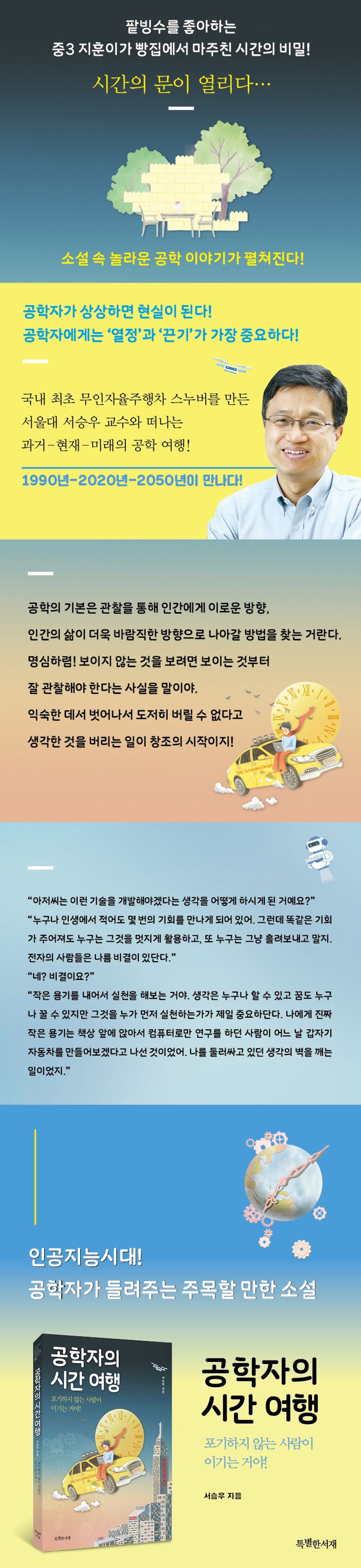 매일 새로운 기술들이 쏟아져 나오고 세상이 하루가 다르게 변하는 것은 어떻게 하면 인간의 삶을 조금이라도 더 편리하게 만들 수 있을까를 고민하는 사람들, 바로 공학자들이 있기 때문이다. 국내 최초 자율주행자동차 ‘스누버’를 만들어낸 서울대 전기정보공학부 서승우 교수는 우리나라에서 자율주행자동차를 가장 오래 연구해온 권위자다. ‘공대생들의 멘토’라고도 불리는 그가 평생을 공학자로 살아온 경험과 철학을 담은 책 『공학자의 시간 여행』을 출간했다.
