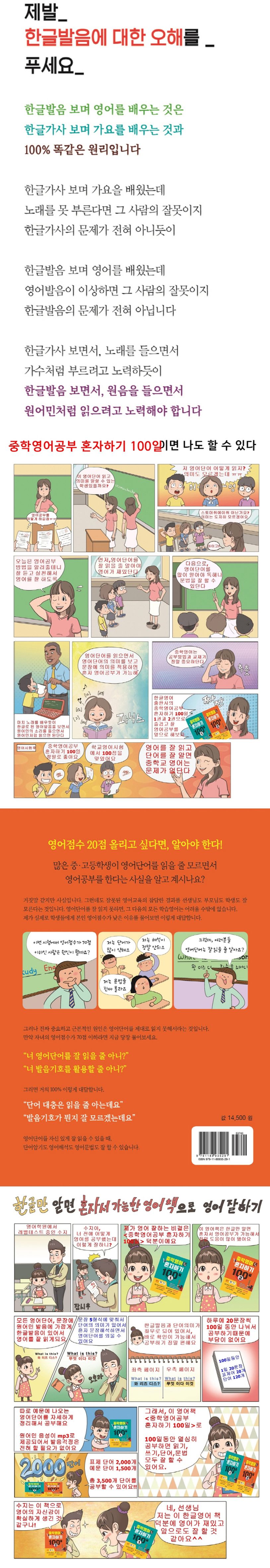 그래서 한글영어의 〈중학영어공부 혼자하기 100일〉은 영어단어나 영어문장에 한글로 영어발음을 적고, 원어민의 음성을 제공해서, 영어발음을 몰라서 예습이나 복습을 포기하는 일이 없이, 자기주도학습이 가능하도록 했다고 합니다. 좌측에는 영어발음이, 우측에는 영어문장이 있어서 서로를 비교해가면서 영어읽기를 할 수 있다고 합니다.