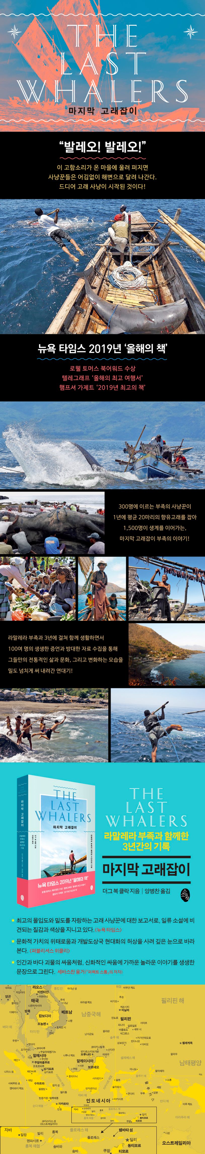 인도네시아의 어느 화산섬에는 대나무 작살과 목선으로 거대한 고래를 사냥해 생계를 이어가는 토착 부족이 살고 있다. 이들은 수 세기 전부터 전통 방식으로 1년에 평균 스무 마리의 향유고래를 잡고, 이웃 부족과 물물교환을 하면서 자신들만의 삶과 문화를 유지해왔다. 그런데 최근 들어 현대화된 문명의 파도가 밀려와 부족사회를 뒤흔들면서 전통적 생활 방식이 붕괴될 위기에 놓여 있다. 이 책은 저널리스트인 저자가 3년에 걸쳐 부족원들과 함께 생활하면서 그들이 들려준 생생한 증언과 대내외적인 변화, 그리고 현실적인 고민과 갈등 등을 밀착 취재한 기록이다. 척박한 자연환경에서도 용기와 지혜를 모아 함께 울고 웃으면서 거친 파도를 넘나드는 이들의 이야기가 긴장감 넘치면서도 가슴 먹먹한 여운을 남긴다.