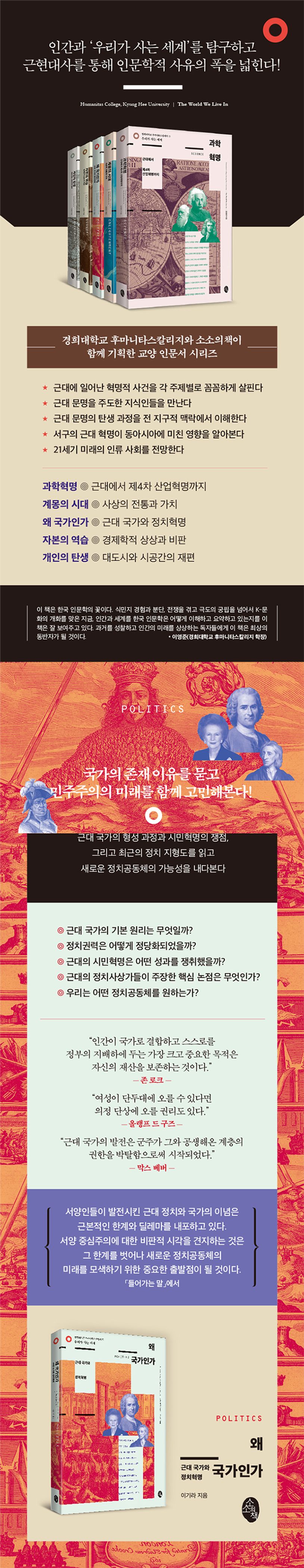 인간은 고대부터 다양한 정치적 질서를 만들고 변화시켜왔다. 그중에서 민주주의는 근·현대 세계를 특징짓는 정치제도로, 고대 아테네에서 기원한 것으로 알려져 있다. 그렇다면 그들은 이런 정치 질서를 어떻게 ‘발명’했을까? 오늘날 우리가 ‘국가’라고 부르는 정치공동체는 왜 존재하고 그 역할은 무엇이며 국가가 지켜야 할 중요한 원칙은 무엇일까? 중세 말 이후 유럽에서 등장한 근대 국가는 공공의 질서를 보장하고 생명과 자유를 포함한 개인의 소유권과 시민권을 보호하는 역할을 위임받았다. 하지만 그러한 역할을 제대로 수행하지 못하면서 갈등과 분열로 대혼란에 휩싸이기도 했다. 이 책은 근대를 대표하는 정치사상가의 저작과 이론을 속속들이 살펴보면서 근대 국가의 형성 과정과 시민혁명의 주요 쟁점, 그리고 최근의 국내외적인 상황에서 빚어지는 정치적 상황을 아우르고 한계에 부딪힌 서양 중심주의에서 벗어나 새로운 정치공동체로 나아가는 방안은 무엇인지 함께 고민해본다.