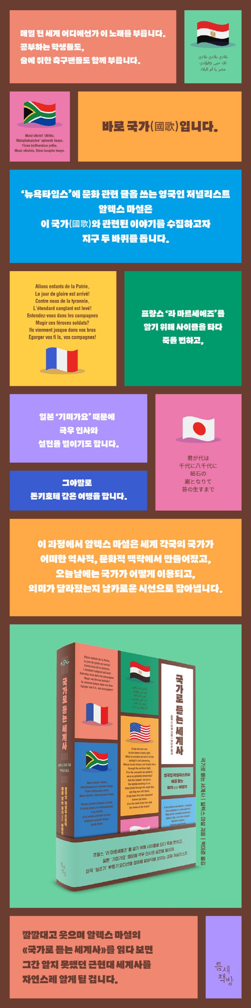 전쟁의 상흔이 가시지 않은 코소보부터, 국가의 대명사 ‘라 마르세예즈’의 나라 프랑스, 위기의 순간 만들어진 미국의 ‘성조기’, 우리가 몰랐던 국가 논쟁을 겪은 일본, 독재자가 만든 노래를 부르는 카자흐스탄 등 국가와 관련된 흥미로운 이야기가 숨 쉴 틈 없이 펼쳐진다. 알렉스 마셜 특유의 영국식 유머는 다소 무거운 주제인 국가 이야기를 유쾌한 여행기로 엮어 독자들이 책을 끝까지 잡게 만든다. 이 책을 다 읽은 독자들은 역사가 세상과 어떻게 연결되어 있는지 확인하는 새로운 관점을 배우게 될 것이다.