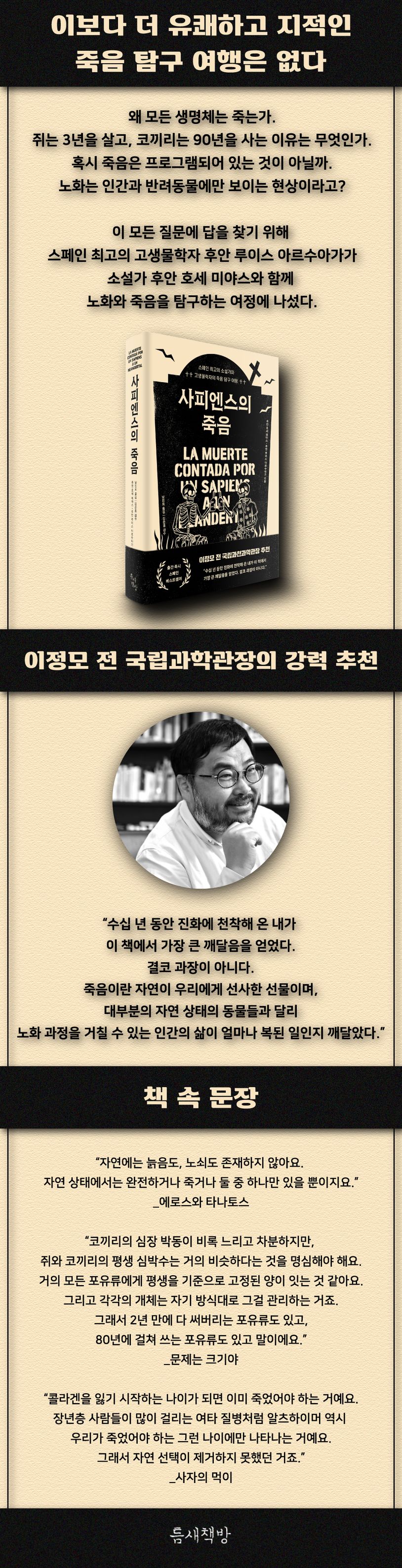 수많은 동물들의 진화 과정을 탐구해 온 고생물학자 아르수아가는 인간이 늙어 가고, 그로 인해 죽는 것은 자연스럽지 않은 일이라고 말한다. 보통의 인간이 죽음을 대하는 방식과는 전혀 다른 그의 냉정한 진단은 아이러니하게도 죽음을 두려워하는 인간에게 위로가 된다. 진화론의 눈으로 봤을 때 인간의 노화와 죽음은 준비된 것이 아니라 오히려 선물 같은 것이기 때문이다. 이에 따르면 자연 선택이 걸러내지 못한 여분의 삶은 오로지 인간의 몫이다. 죽음에 대한 온갖 철학적인 사유에도 불구하고 진화론이 정의하는 죽음이 우리의 마음을 울리는 이유는, 인간 역시 자연의 일부이며 자연 선택의 결과이기 때문일 것이다.