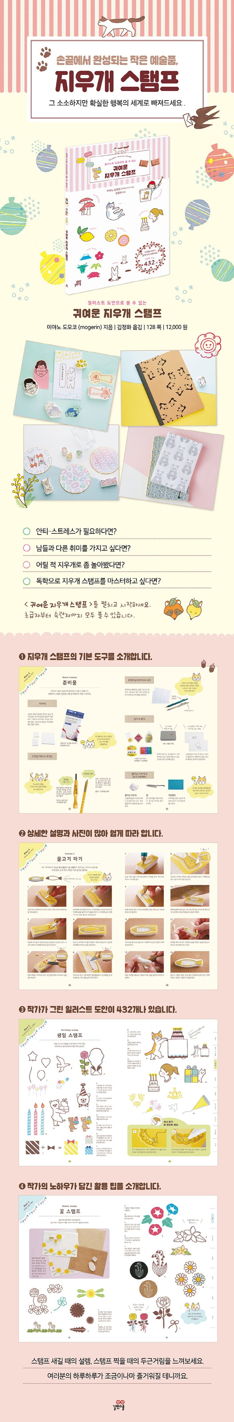 어떤모양으로지우개스탬프를만들어야할지모르겠다면걱정하지마세요.[귀여운지우개스탬프]책에는지우개스탬프도서가운데가장많은도안432개가수록되어있습니다.예쁜일러스트를찾는다고번거롭게웹검색하고,저장하고,출력하지않아도됩니다.
