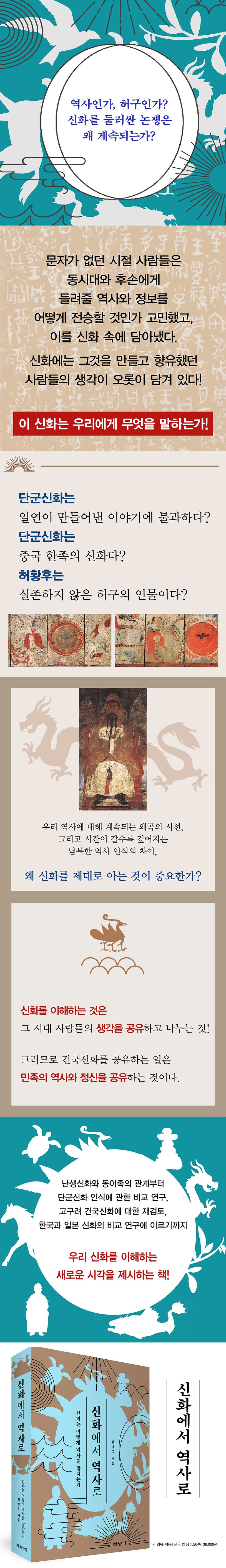 단군은허구가아닌역사다!신화를두고벌어지는계속되는논란을잠재울새로운시각『신화에서역사로』는신화인식에대한역사적고찰,난생신화와건국신화에대한연구,중국ㆍ일본신화와의비교연구등을통해우리건국신화에담긴사상과이념,역사를새로운시각으로조망한다.이책은총4부로구성되어있다.1부에서는난생신화와동이족의관계를파헤친다.난생신화는중국한족과관계가없는우리동이족의신화임을여러논거를바탕으로밝히고있으며,중국한족이그들의시조로섬기는황제가과연한족의시조인지도살핀다.2부에서는단군신화와난생신화의연관성을살펴본다.학자들마다이구동성으로동이족신화는난생신화라고하는데,단군신화는왜난생신화가아닐까?이러한의문의답을찾기위해단군신화속에담긴역사적상징들을해석하는한편,단군을부정하는계보를추적한다.3부에서는고구려건국신화속하백의출자를살피면서식민사학카르텔이얼마나견고하게작동해왔는지비판한다.4부에서는일본에서가야와임나가같은것이라고주장하기위해김수로와허왕후가모두허구의인물이라고주장하는것에반박해가야건국신화와일본신화를비교분석한다.김수로와허왕후가실존인물임을보여주는여러자료들을통해그들과가야가실존하는역사임을증명한다.저자는이를통해건국신화가우리선조들의건국이념과역사를상징적으로표현하고있음을강조하는데,이때핵심이되는단어가바로천손사상이다.천손의자손이라는생각은‘알’이라는형상으로표현되기도하지만,환웅처럼하늘에서직접하강하기도한다.천손이라는자부심은널리인간을이롭게한다는홍익인간의실천으로나타난다.우리는정신(무의식)에홍익인간이내재되어있어서‘나’보다는‘우리’라는말을지향하고,개인의사생활도존중하지만역사적으로공동체적삶을지향했던것이다.세계적으로우리나라보다‘우리’라는말을많이쓰는민족이나국가는없다.‘우리’라는말속에이타심과융합정신이들어있기때문에타인의행복과복리를생각한다.오늘날우리나라가문화강국이될수있었던것도홍익인간정신이기저에흐르고있기때문일것이다.건국신화를공유하는일은민족의역사와정신을공유하는것이다.역사와신화가중요한이유다.일제가역사와신화의왜곡에앞장선이유이기도하다.저자는일제강점기사학자들이우리역사를왜곡하고천자의자손이라는강한우리의자부심을부정하고자만든신화해석의틀에서벗어나요동의드넓은땅을달리던기마민족의후예답게천자의자손이라는자부심으로우리신화를바라보자고제안한다.신화를올바르게이해하는것은바른역사인식의첫걸음이될것이다.
