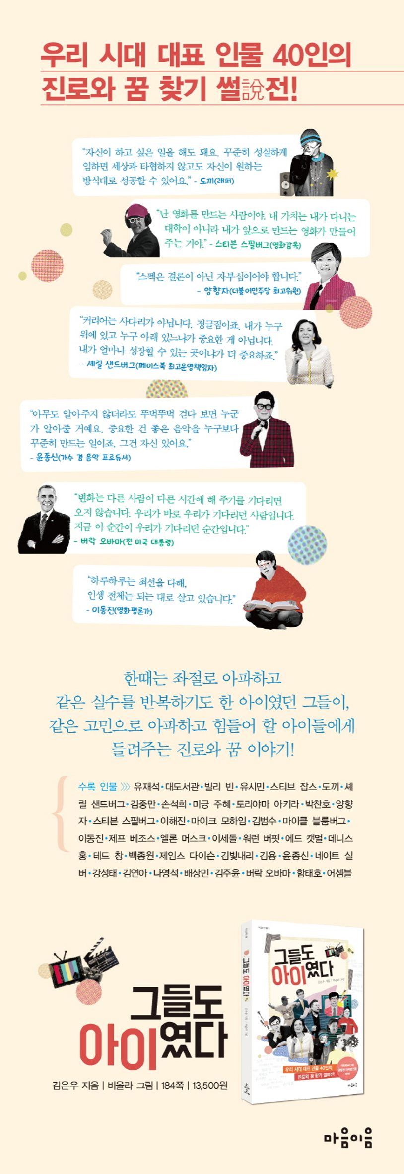 현재, 자기가 활동하는 분야에서 최고 자리에 오른 인물들. 그들은 하루아침에 그 자리에 우뚝 선 걸까? 아니다. 그들도 좌절을 맛보고 같은 실수를 반복하기도 한 평범한 아이였다. 한때 나와 다름없는 평범한 아이였던 그들이, 같은 고민으로 아파하고 힘들어 할 아이들에게 들려주는 진로와 꿈 이야기!