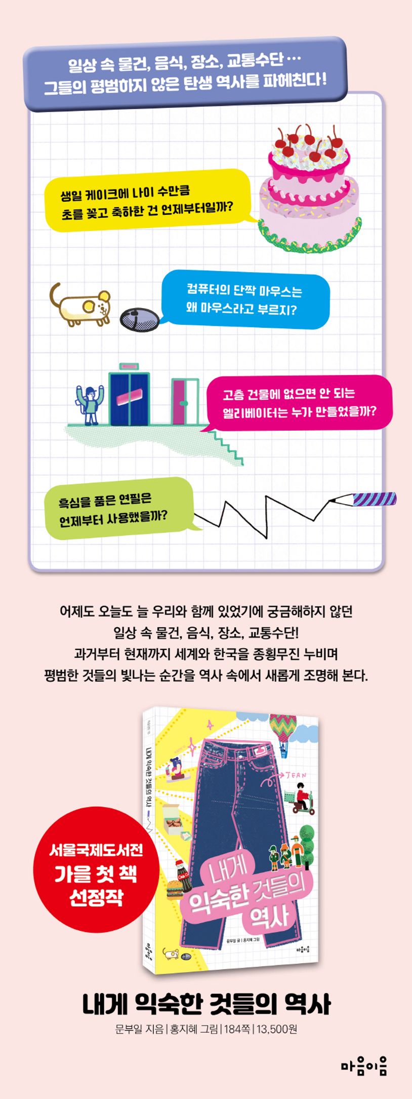 이 책에서는 도서관, 영화관, 슈퍼마켓, 찜질방 등 우리를 둘러싼 여러 장소를 비롯해 치킨, 라면, 콜라, 돈가스 등 흔히 먹는 음식뿐 아니라 냉장고, 연필, 진공청소기, 스마트폰 등 없어서는 안 되는 생활필수품과 여러 교통수단까지 늘 우리와 함께 있었기에 너무나도 익숙한 40가지의 탄생 역사를 파헤친다. 문부일 작가는 이러한 것들이 어떻게 사람들과 얽히며 역사를 만들고 우리 생활을 변화시켰는지 과거부터 현재까지 세계와 한국을 종횡무진 누비며 평범한 것들의 빛나는 순간을 역사 속에서 새롭게 조명해 본다.