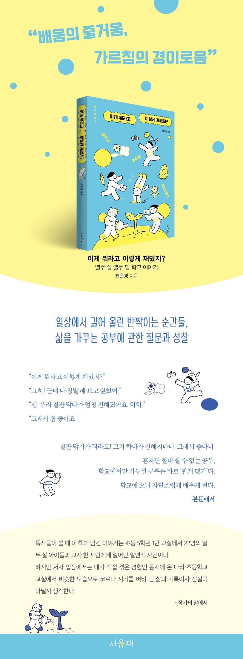 비평, 에세이, 소설 등 다양한 방식으로 교육 이야기들을 담아 가고 있는 서유재 교육서 시리즈 ‘함께교육’의 일곱 번째 책. 30년 넘게 현직에서 아이들과 함께해 온 최은경 선생님의 교단일기 『이게 뭐라고 이렇게 재밌지?』는 서로의 기색을 살피고 돌보며 명랑한 마음과 다정한 시선으로 하루하루 애쓰는 일상이 담겨 있다. 그리고 이 평범한 일상을 귀하게 들여다보는 일이야말로 어떤 어려움도 당당하게 마주할 수 있게 하는 힘이라고 말한다. “교사는 최고의 예술(supreme art)이자 보람 있고 가치 있는 일”이라고 한 존 듀이의 말을 떠올리면서 이 책이 2023년 여름, 학교와 교육을 생각하는 이들에게 작은 희망이 되길 바란다.