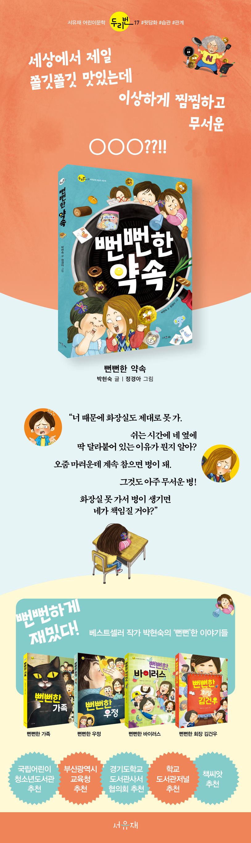『뻔뻔한약속』은‘뻔뻔’시리즈다섯번째이야기입니다.이번에는‘뒷담화’를소재로하고있습니다.남녀노소불문하고세상에서제일재미있다는남이야기말입니다.내가없는자리에서나에관해나눈별로좋지도않은이야기에관한경험없나요?너무사소하고아무것도아니라정색하고따지기도뭣한거말이에요.앞서나온‘뻔뻔’시리즈의다른이야기들처럼이번에도두가지사건이쌍둥이처럼서로교차되면서흘러갑니다.그리고오하얀의친구인빈후와나동지엄마로부터시작된일은한바탕대소동으로이어집니다.언제나그렇듯두주인공은힘을합쳐지혜롭게이파국을수습해내지만어쩐지나동지는영찜찜합니다.