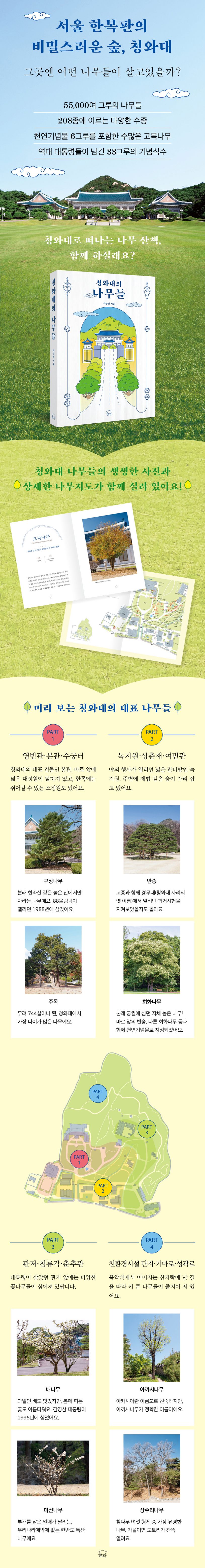 2022년 5월 10일, 청와대가 개방되었다. 1948년부터 74년간 대한민국 대통령의 집무실이자 관저였던 청와대는 한편으로는 서울 도심에서 찾아보기 힘든 넓은 정원과 깊은 숲이 있는 곳이기도 하다. 예부터 북악산 자락을 따라 자연스레 자라온 나무들은 물론, 이후 조경을 위해 일부러 심은 나무들까지 모두 합쳐 5만 5천여 그루에 이르는 나무들이 있으며, 종류도 208종에 달할 정도로 다양하다. 이들 중에는 지난 9월 ‘청와대 노거수군’이란 이름으로 천연기념물로 일괄지정된 반송, 회화나무, 용버들 등 크고 나이 많은 고목나무도 적지 않으며 역대 대통령들이 남긴 기념식수도 확인된 것만 31건(33그루)에 달한다. 넓은 길과 산책로를 따라 수많은 나무들을 만날 수 있는 청와대는 그야말로 거대한 식물원이라 해도 좋다.