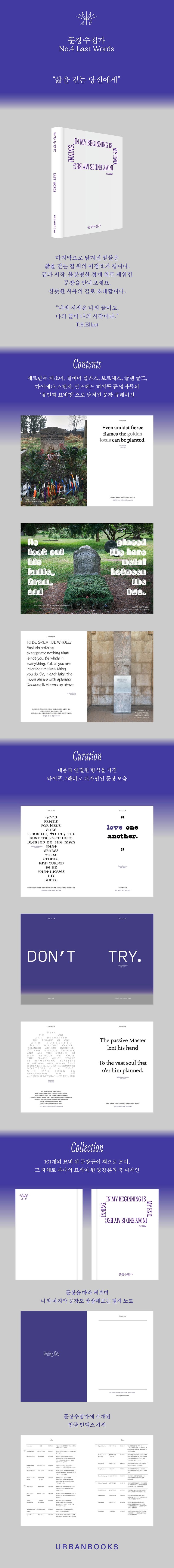 『문장수집가』는 언어의 홍수 속에서 사유의 문장들을 수집하고 소개하는 북시리즈입니다. 4호 ‘Last words’에서는 유언과 묘비명으로 남겨진 101가지의 문장을 한데 모았습니다. 페르난두 페소아, 실비아 플라스, 프란츠 카프카 등의 작가부터 글렌 굴드, 드미트리 쇼스타코비치와 같은 음악가, 그 외 영화감독, 정치인, 물리학자 등 폭넓은 직업을 가진 명사들의 마지막 언어를 수록하였습니다.